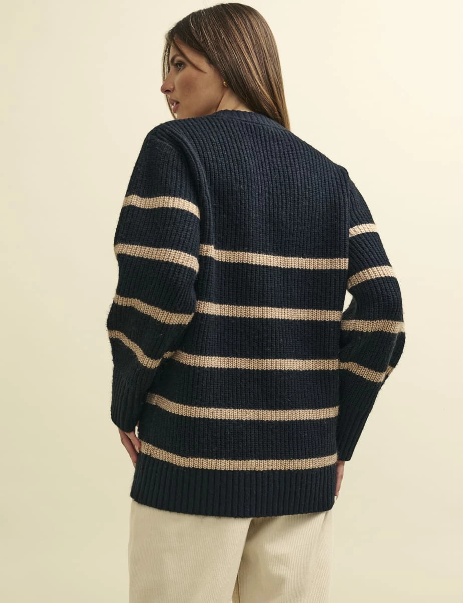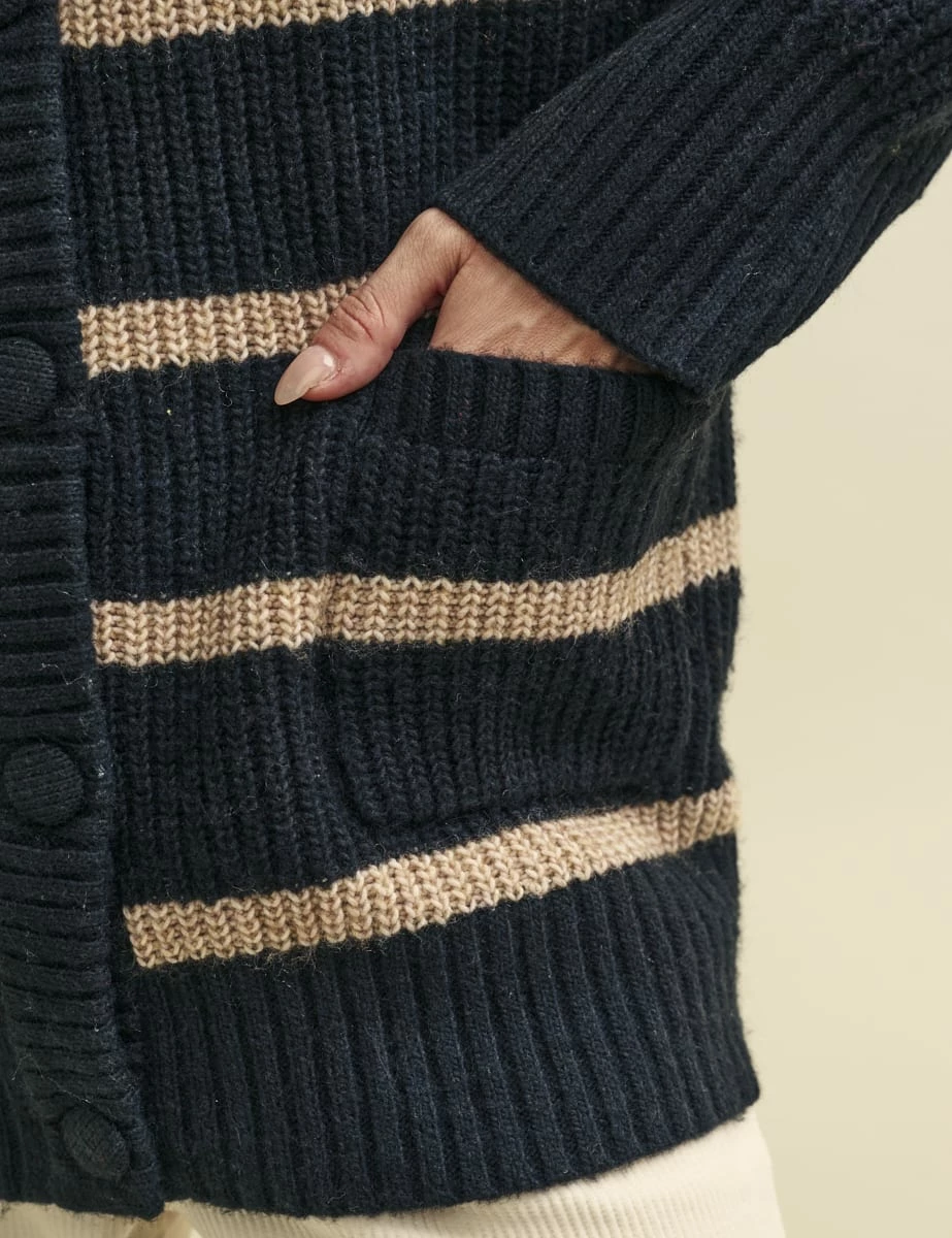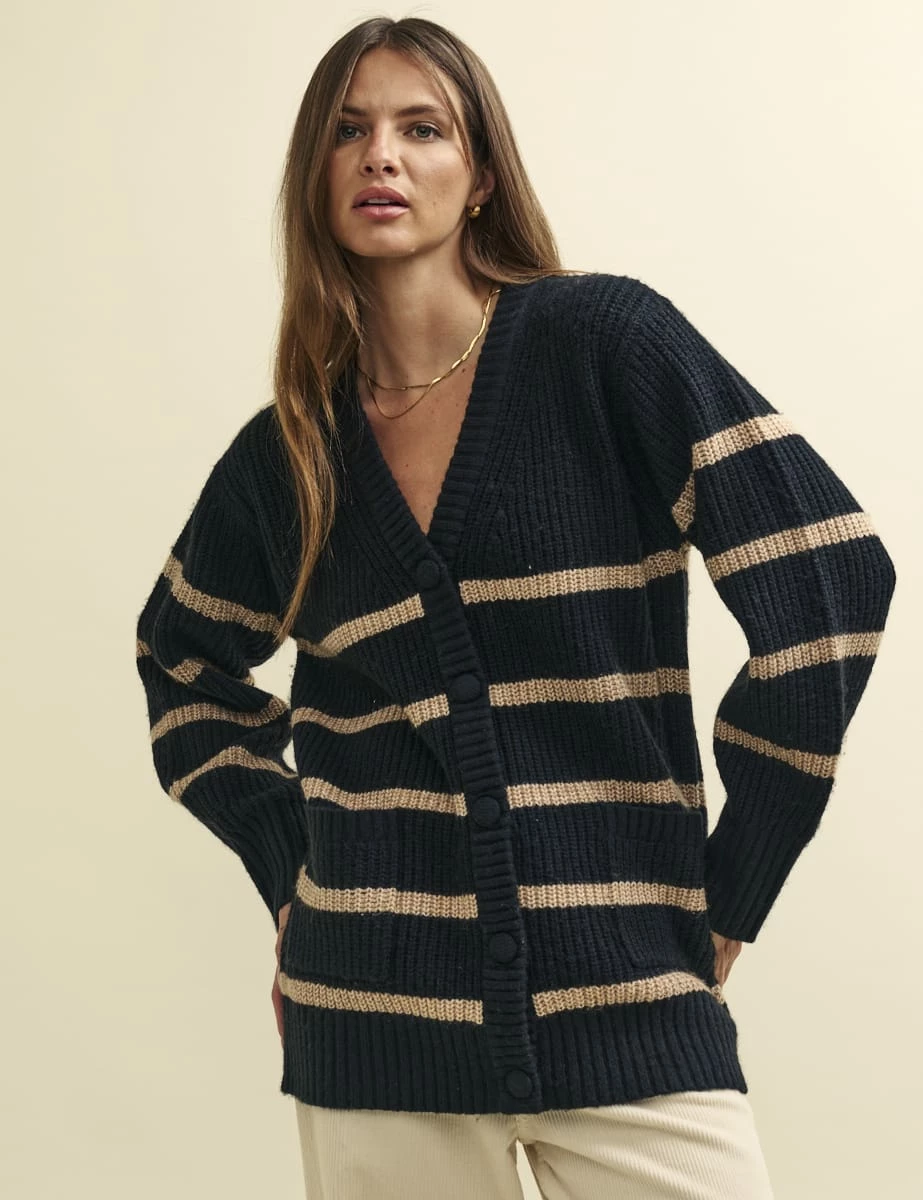 Curl up in this cosy cardigan. Cut to a long length in a fluffy fabric blend that includes recycled materials and a touch of wool, you’re sure to wear it on rotation. We love the black and biscuit-coloured stripes. Just add cream cord trousers.