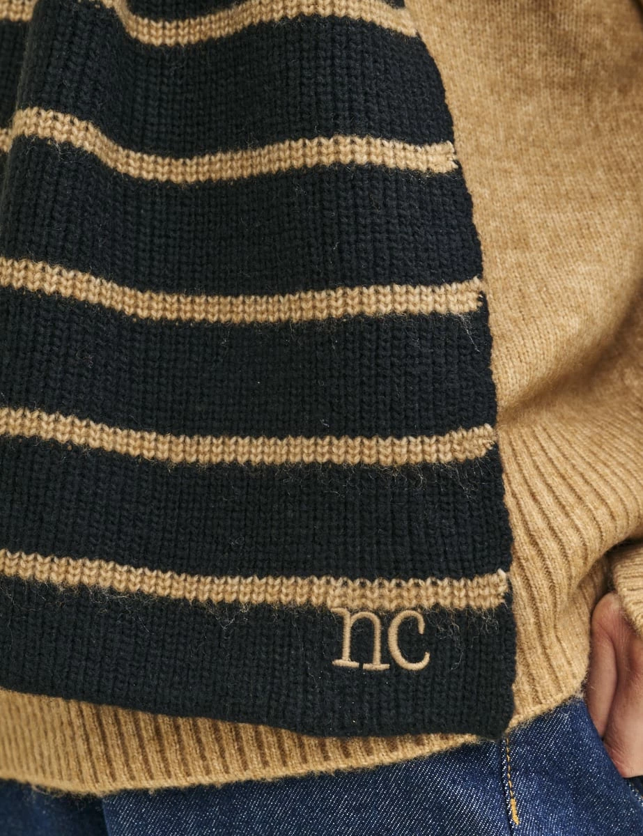 Pile on the softness with a chunky knitted scarf. Made from a fluffy fabric blend, this one includes recycled materials and a touch of wool. Finished with our signature NC embroidery, the black design with biscuit stripes is perfect for pairing with a tonal knit. Style yours accordingly.