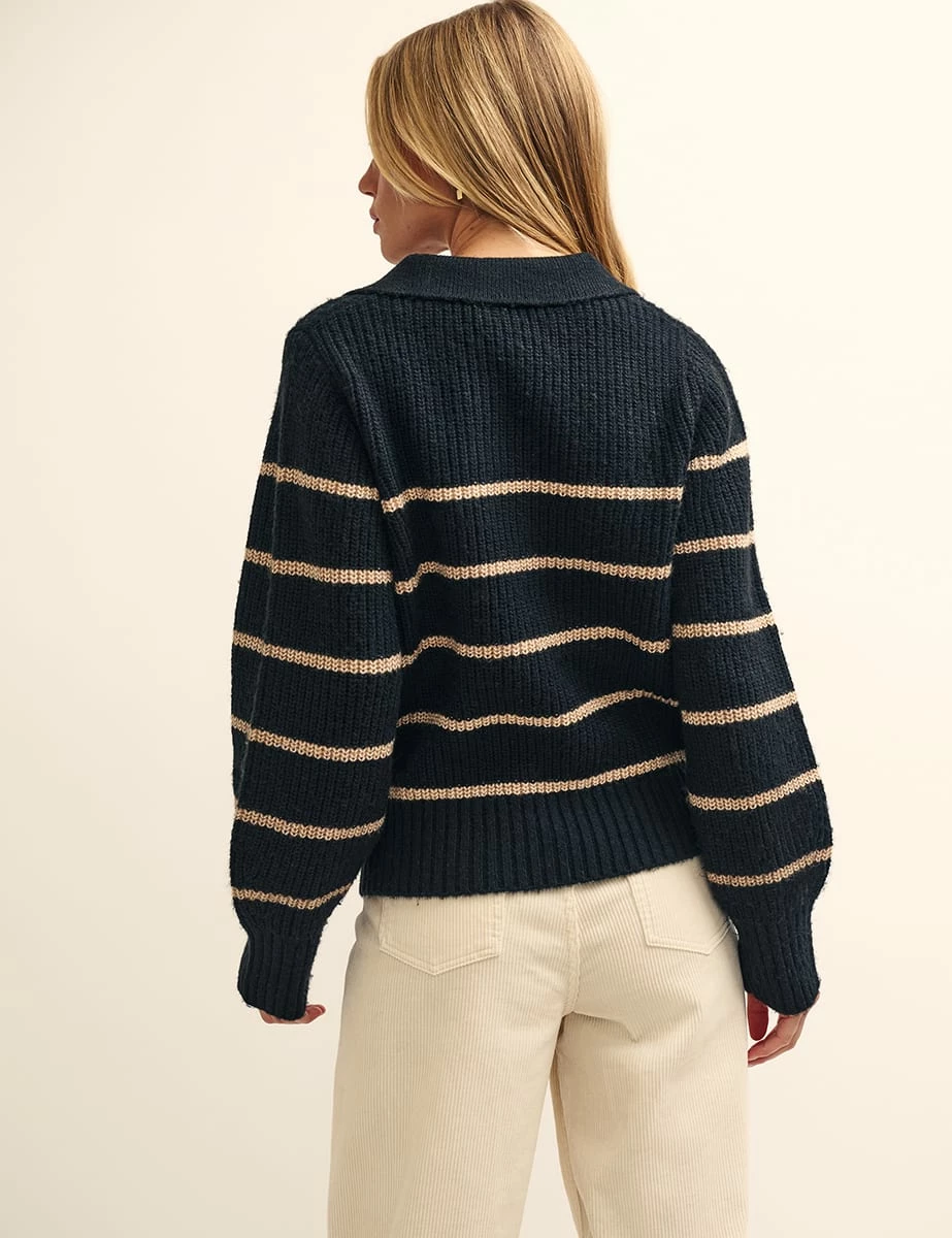 Line up. This black and biscuit stripe knit features long sleeves and ribbed cuffs. This one’s made from a super soft blend that includes recycled materials with a touch of wool. It’ll go with everything you already own.