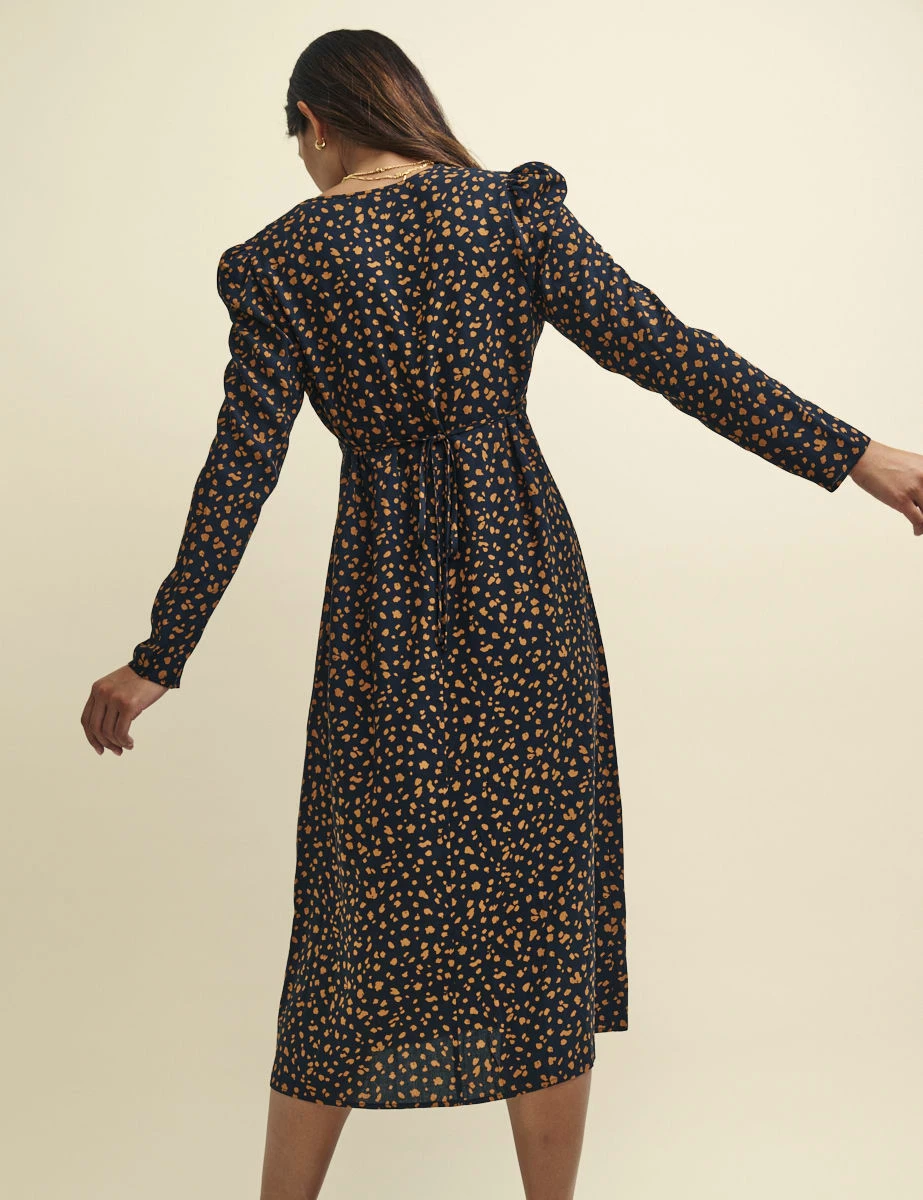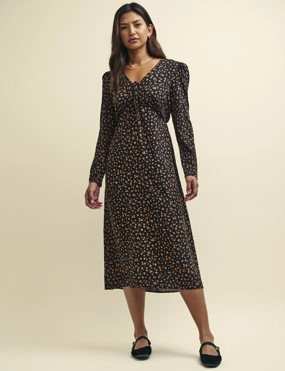 Lily’s ready for that thing you’ve got to go to this autumn. Designed with long sleeves, she’s detailed with a lightly fluted hem and ties at both the front and back. We love that she’s cut entirely from responsible black viscose dotted with an artful smudge print. Just add Mary Jane shoes.