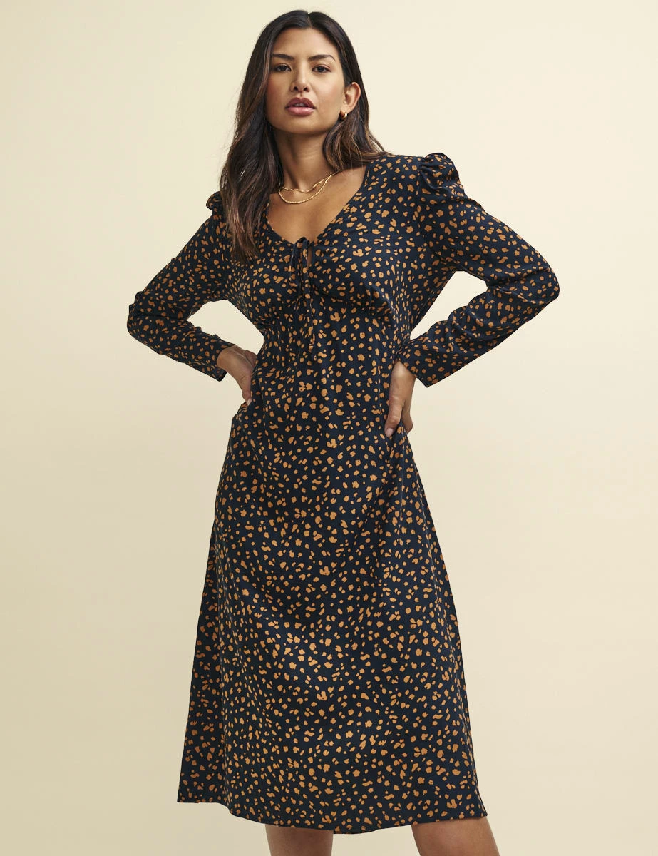 Black and Orange Spot Print Long Sleeve Lily Midi Dress