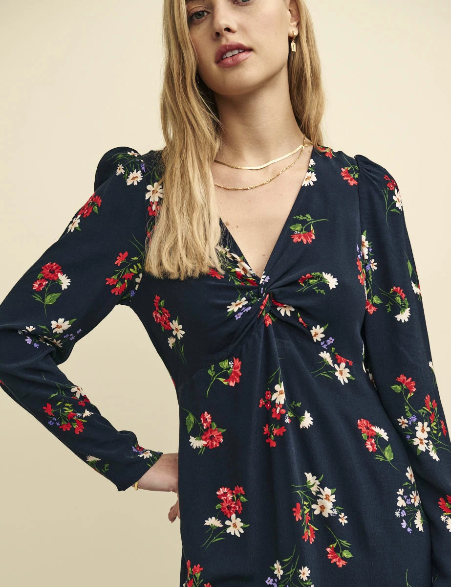 A classic dress with a so-now twist. Perfect for that drinks you’ve got coming up, our Katty mini plunges into a v-neckline with a knotted front for detail. We love the wildflower print that you can wear solo now and later with tights. Style yours with western boots.