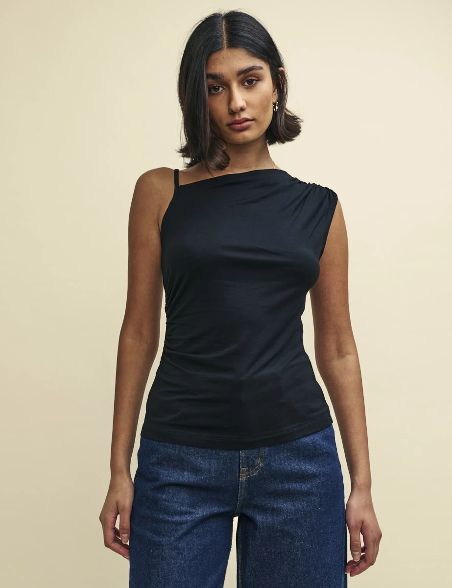 The one-shoulder look is back. Tapping into the asymmetric trend, this black top includes statement ruching offset by a single strap. It’s made from a responsible viscose blended with a touch of stretch for an always perfect fit. Style yours with your favourite denim.