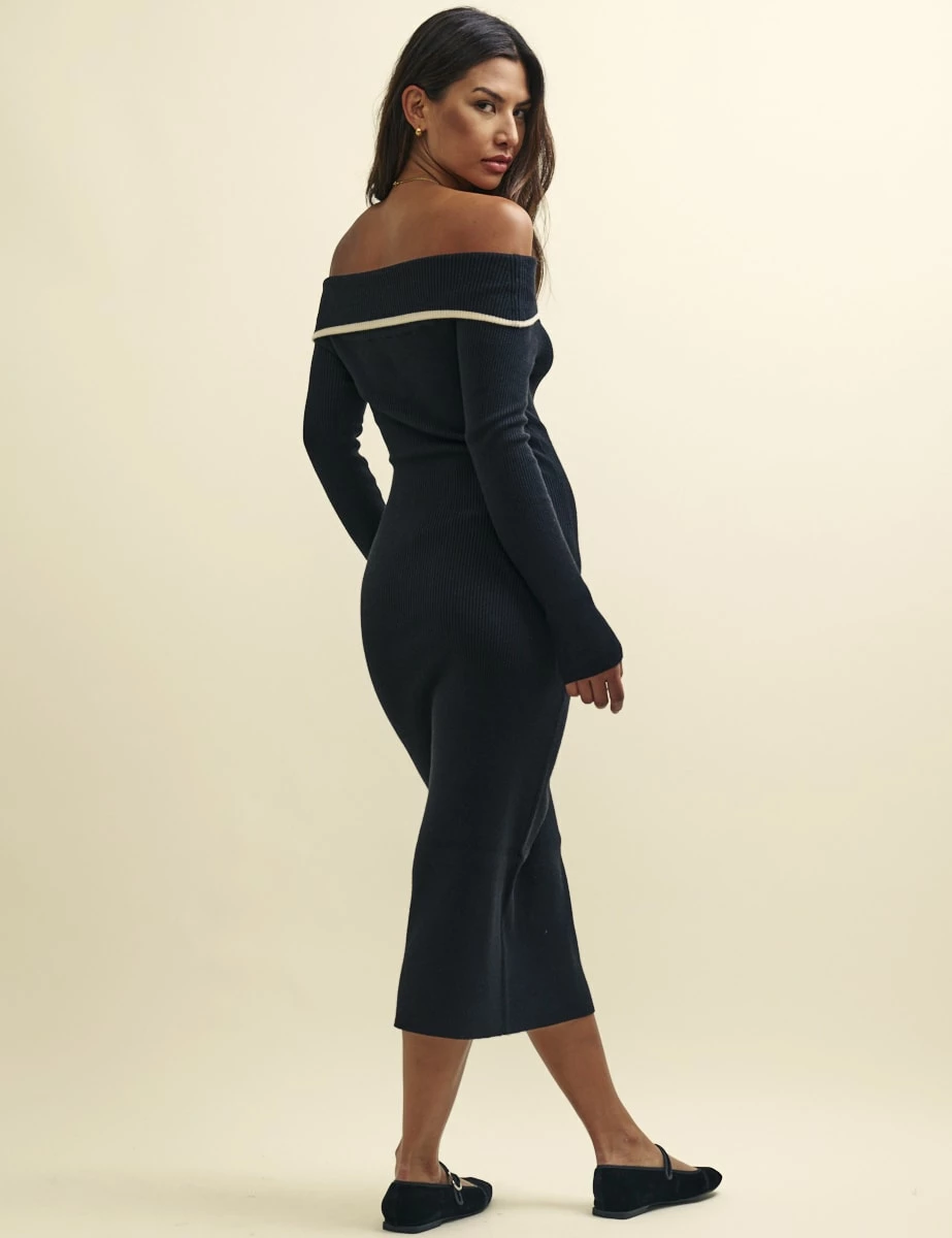 Meet you in Paris. This Bardot midi dress is the epitome of sophistication. Knitted from a super soft responsible viscose blend, it’s designed to follow your frame perfectly. We love the white contrast tipping. Style yours with barely-there sandals for that dinner reservation.