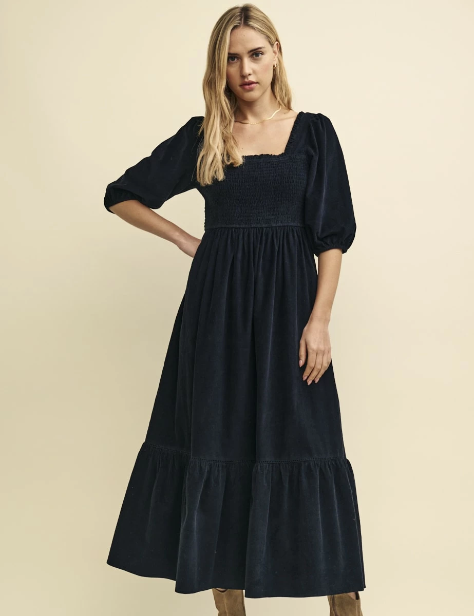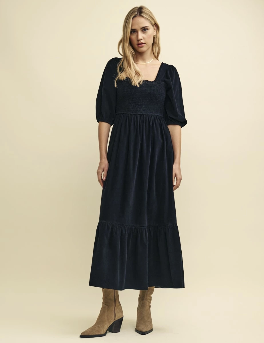 There’s lots of love about this black dress. We’re obsessed with the frill trimmed square neckline and statement shirring that makes a focal point of your waist before falling into an easy midaxi hem. Perfect for winter in soft cord, Elsa is made entirely from organic cotton. Style yours with suede boots.
