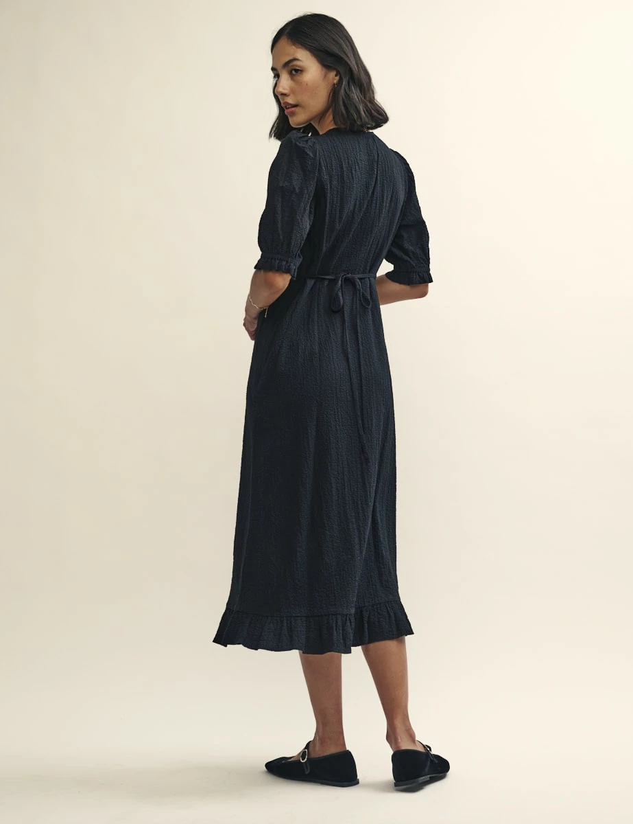 Delilah is a tea dress with a twist. Made from an organic cotton blend, this classic black midi will be worn all year round. A low neckline plunges into a flattering v-shape, offset by pretty puff sleeves trimmed with pleated edges and a frill hem. The cuffs have been stitched with a touch of stretch so you can adjust the volume. Style yours with everything you already own.