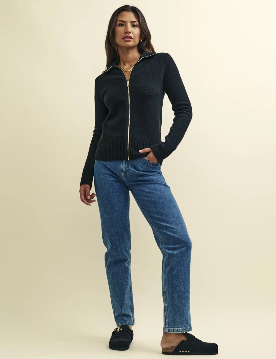We love a gold accent. Made from a softer-than-soft fabric blend that includes recycled materials and a touch of wool, this zip-up cardigan is super easy to wear in classic black. Style yours with mid-wash denim.
