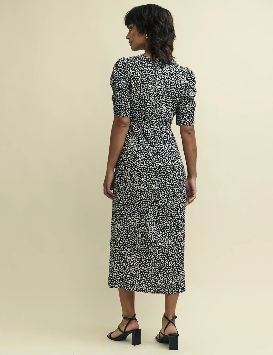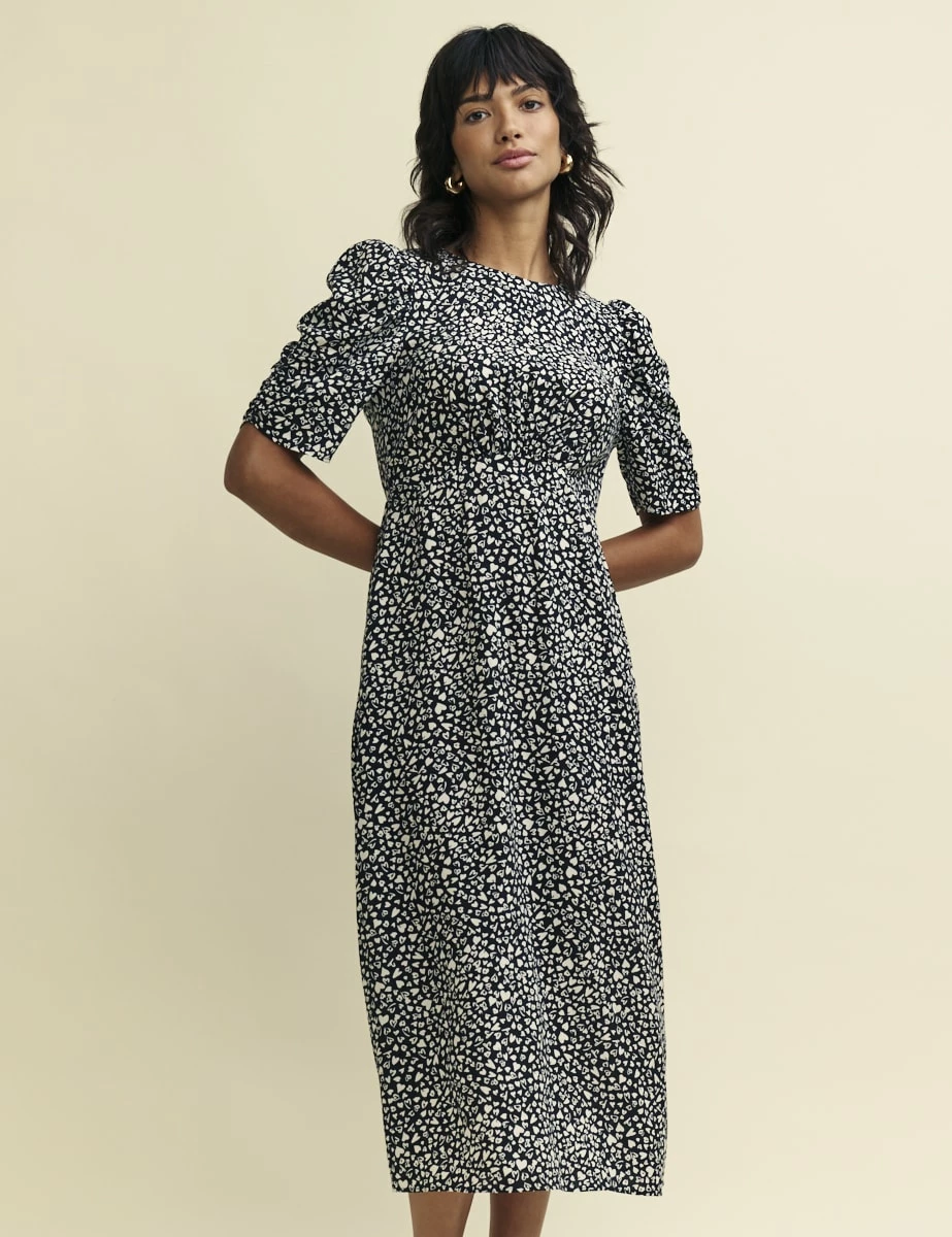 Returning for another season, our Evie tea dress comes in a black and white heart print made entirely from responsible viscose. Ruched sleeves and a curved waist seam add to the look. Elevate yours with gold jewellery.