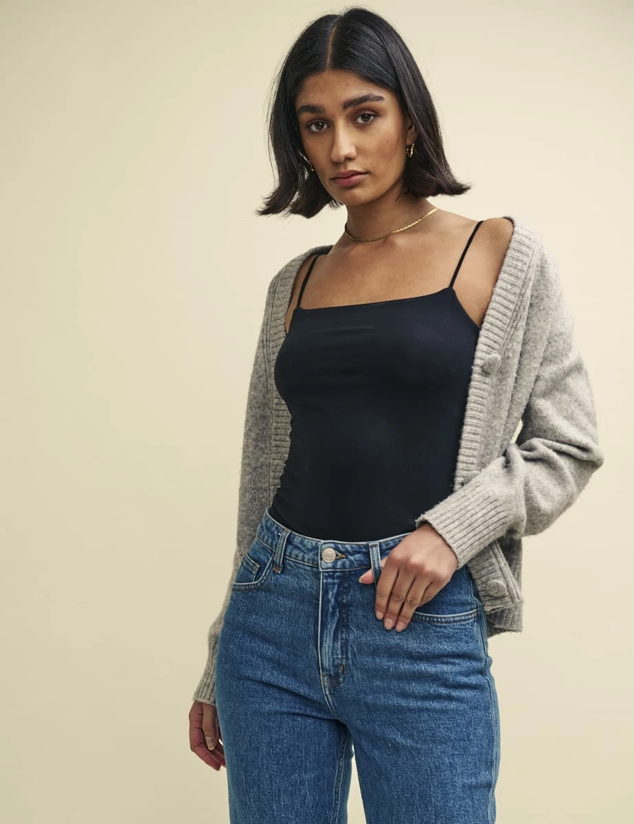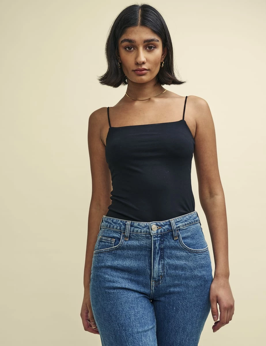 Show off those shoulders. Cut with barely-there straps, this black cami is needed in every wardrobe. Made from responsible viscose, it’s been blended with a touch of stretch to get that perfect fit. Style yours with everything you already own.