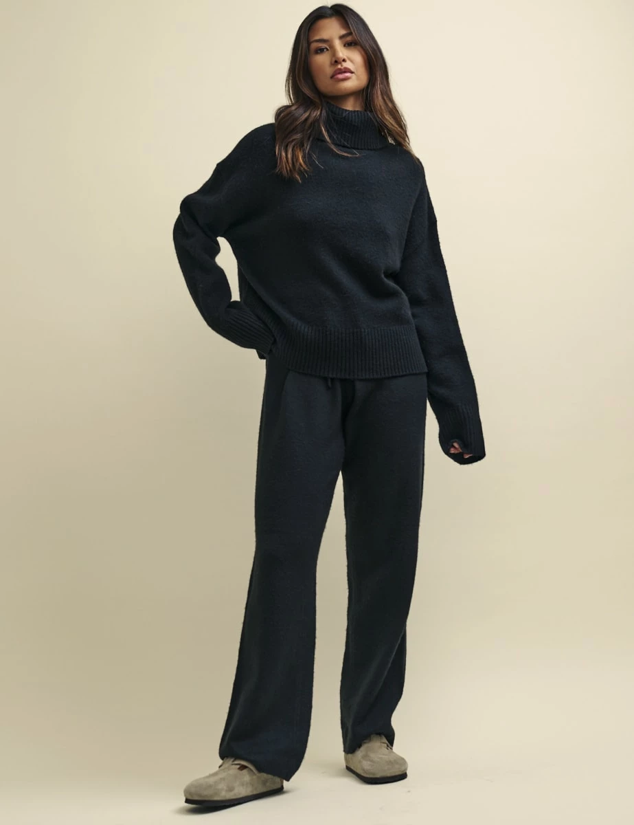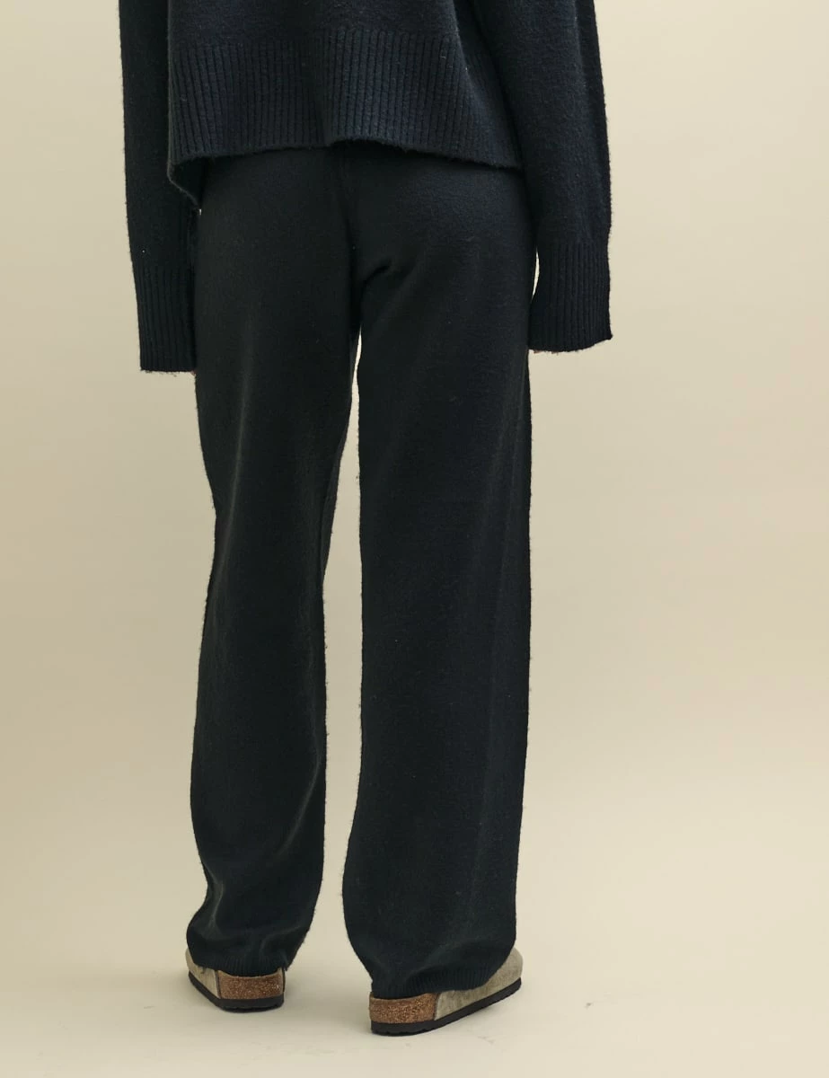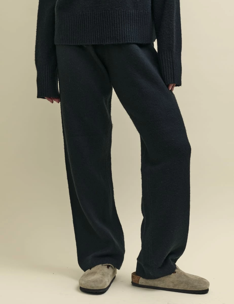 Soft and cosy. Made from a fluffy black fabric blend that includes recycled materials and a touch of wool, these knitted trousers are so easy to wear. You’ll love the wide leg silhouette with a comfortable drawcord waist. Wear yours outside with a matching jumper.