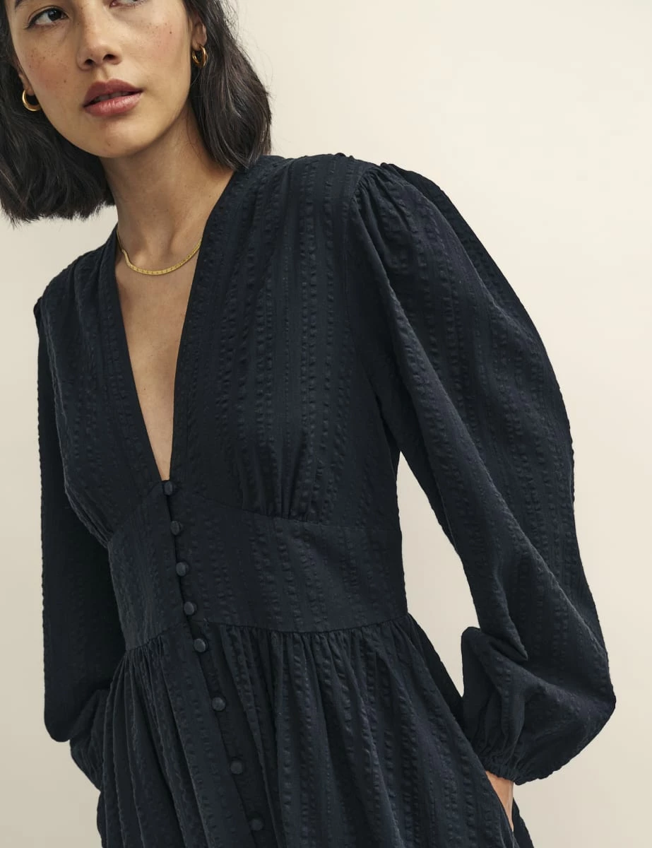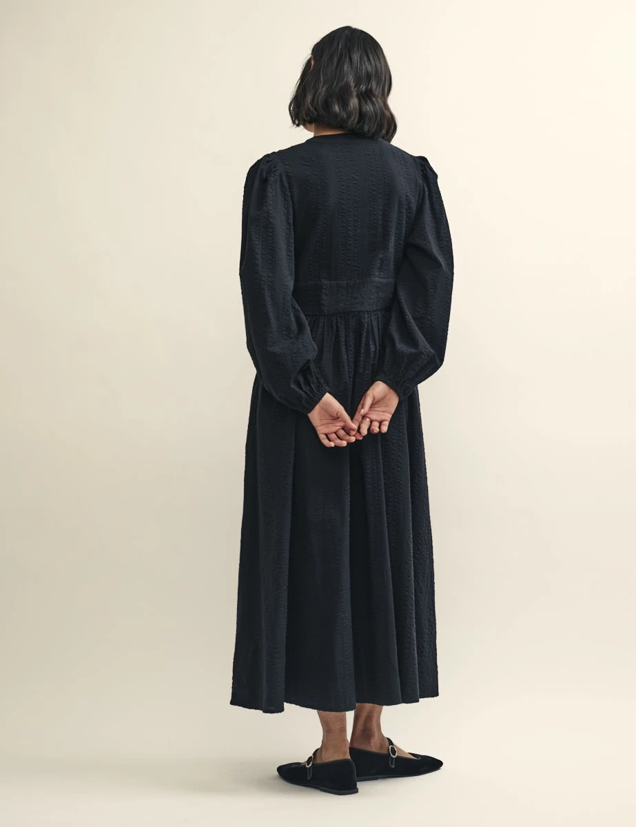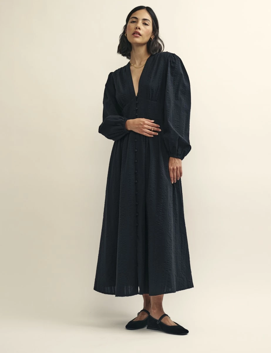 An autumn-ready take on our stellar style, Starlight. Made from black seersucker cotton that’s lightly textured, she’ll take you from day to night in an instant. We’re obsessed with her soft gathering, balloon sleeves and pretty line of covered buttons – she’s even got pockets. Effortlessly relaxed in fit, we’d recommend sizing down if you like a closer cut. Style yours with Mary Jane shoes.