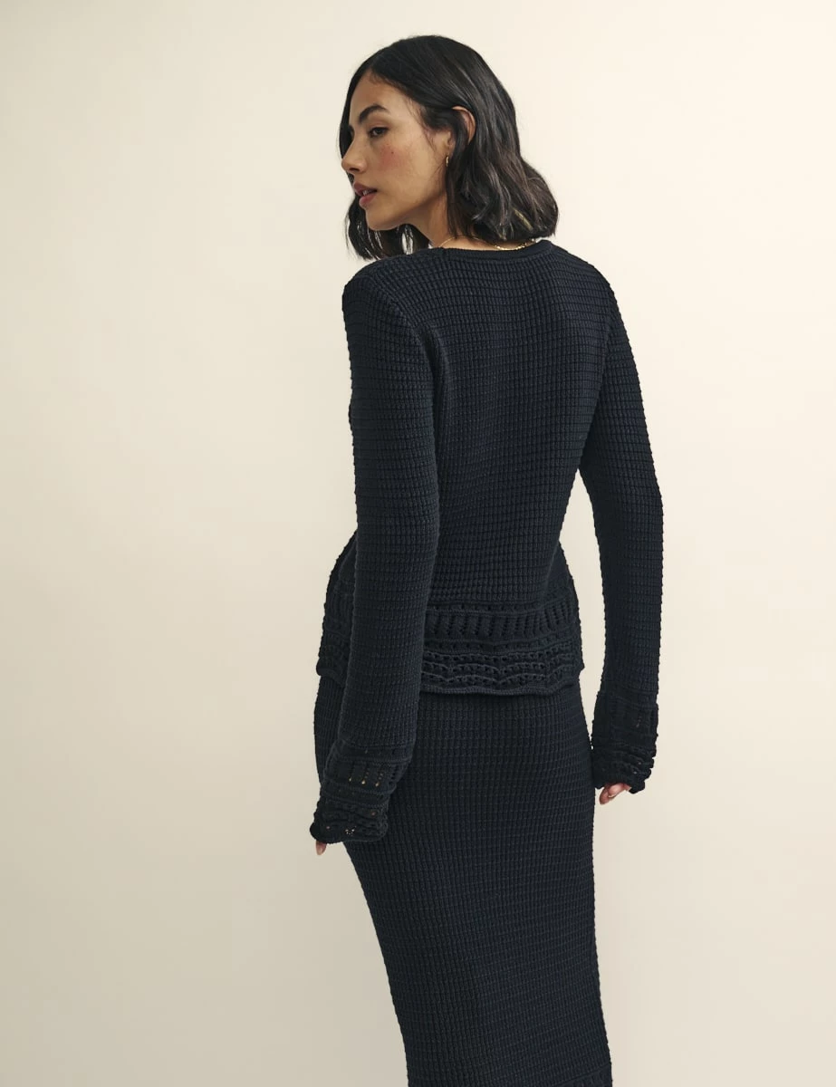 You can’t go wrong with this crochet style cardigan. Made from black organic cotton, it’s knitted with fluted sleeves and a string tie that instantly gives off a 70s vibe. Style yours with the matching midi skirt and stompy boots. You might be buying it for a festival but you’re sure to wear it all summer.