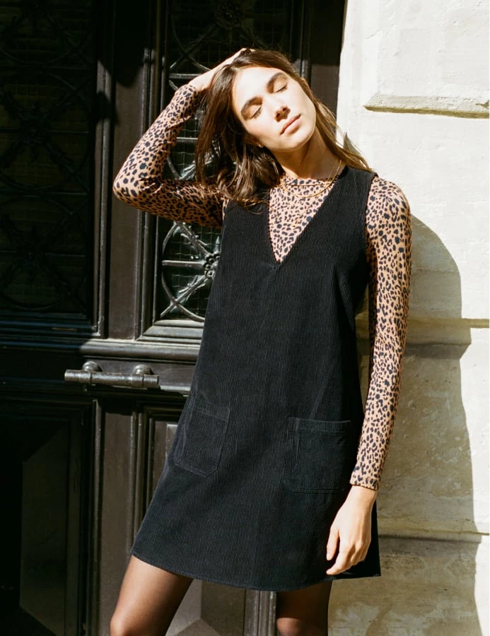 Piper’s back but not for long. Made entirely from cotton, this black cord pinny features a deep v-neckline and two pockets at the front for your everyday essentials. Layer yours over a long sleeve top and pair with boots for a true throwback style.