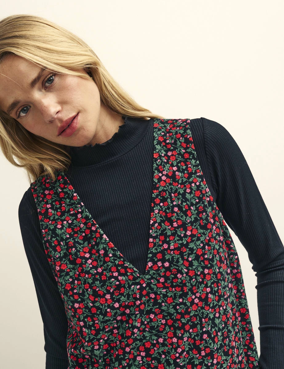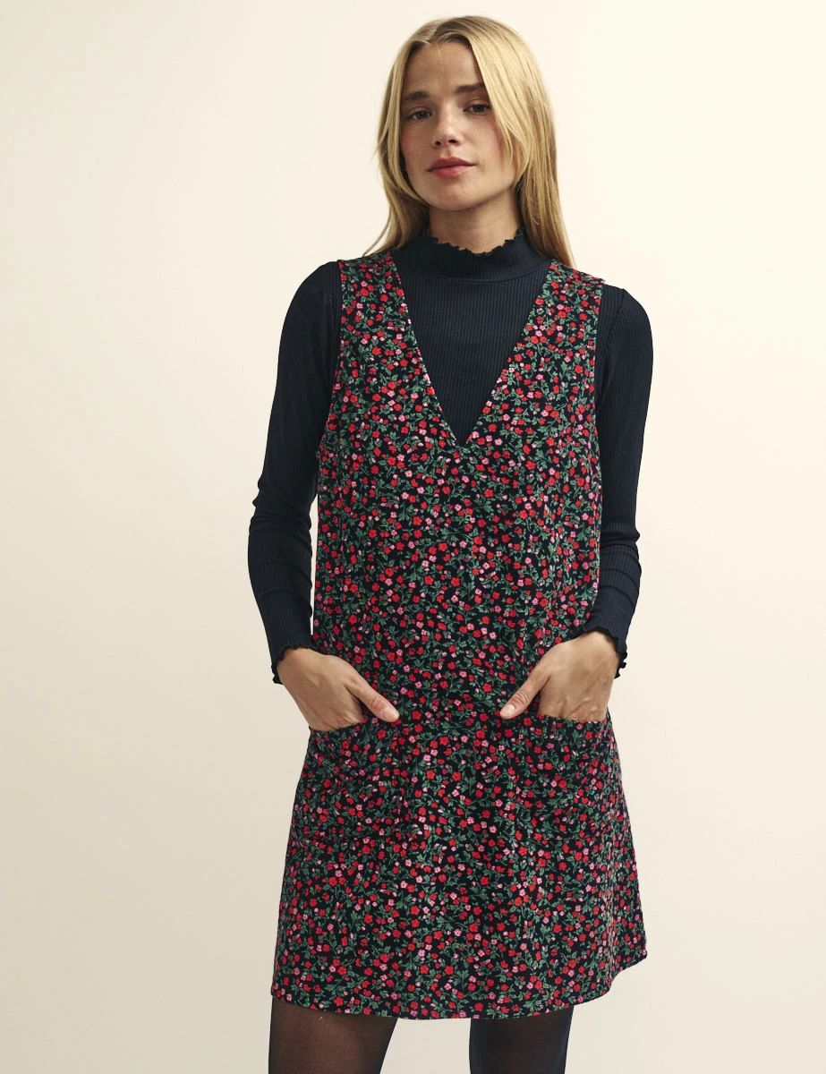 Our autumn essential. Made entirely from organic cotton, this floral cord pinny features a deep v-neckline and two pockets at the front. We’re layering ours with a frill collar top.