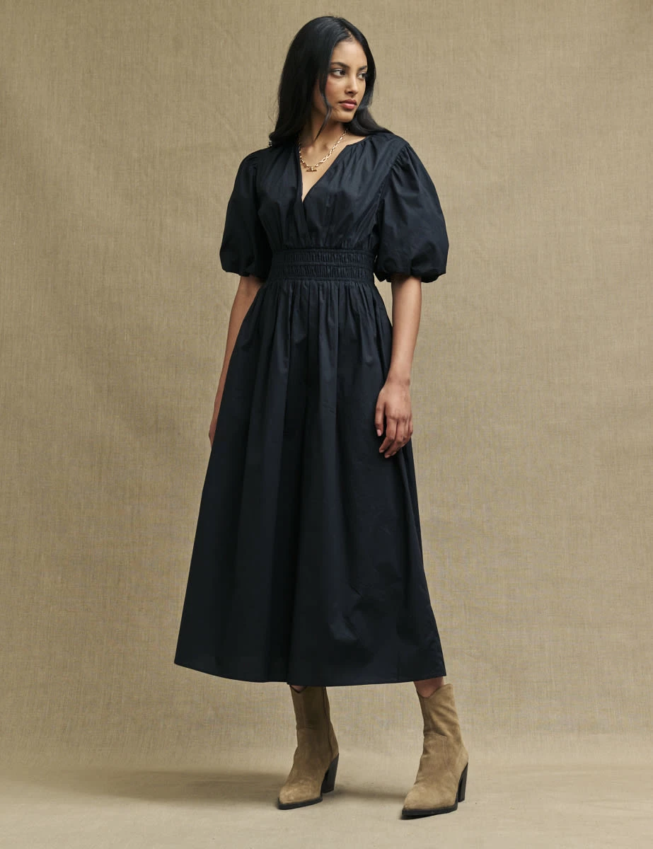 Go incognito in a black dress. Made entirely from organic cotton poplin, this puff sleeve midi is a dream – pure and simple. A wrap-effect front, shirred waistline and a-line skirt come together to flatter your shape from all angles. Style yours simply with a hint of gold jewellery.