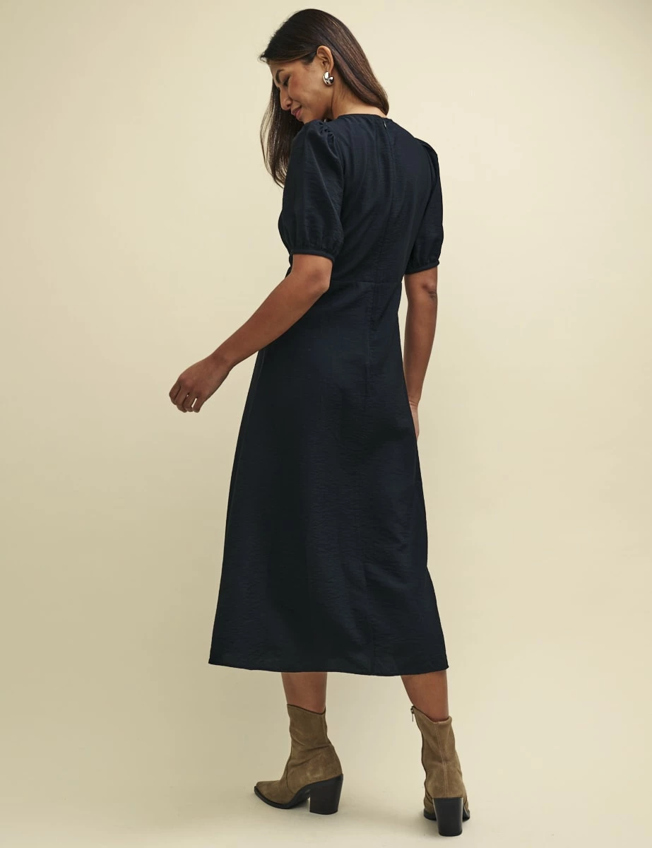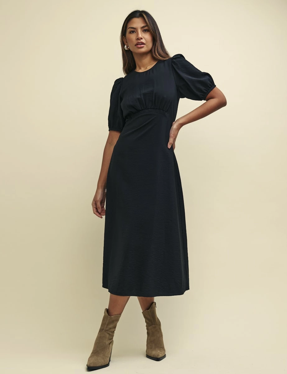 Say hello to Bonnie. She’s a true femme and we’re in love. Made from a responsible black viscose blend, this dress is entirely timeless. Puff sleeves add to the look. Style yours with everything from retro trainers to stompy boots.