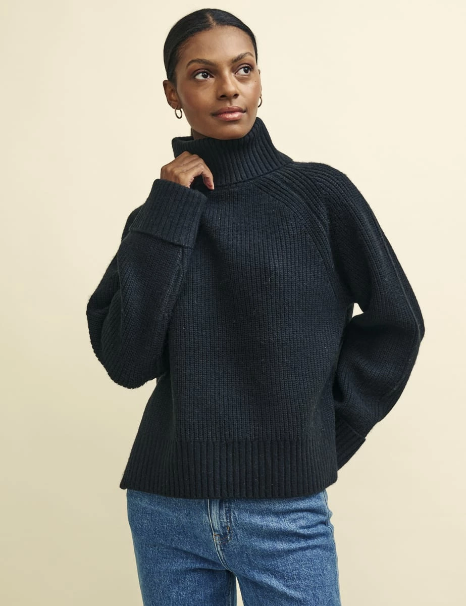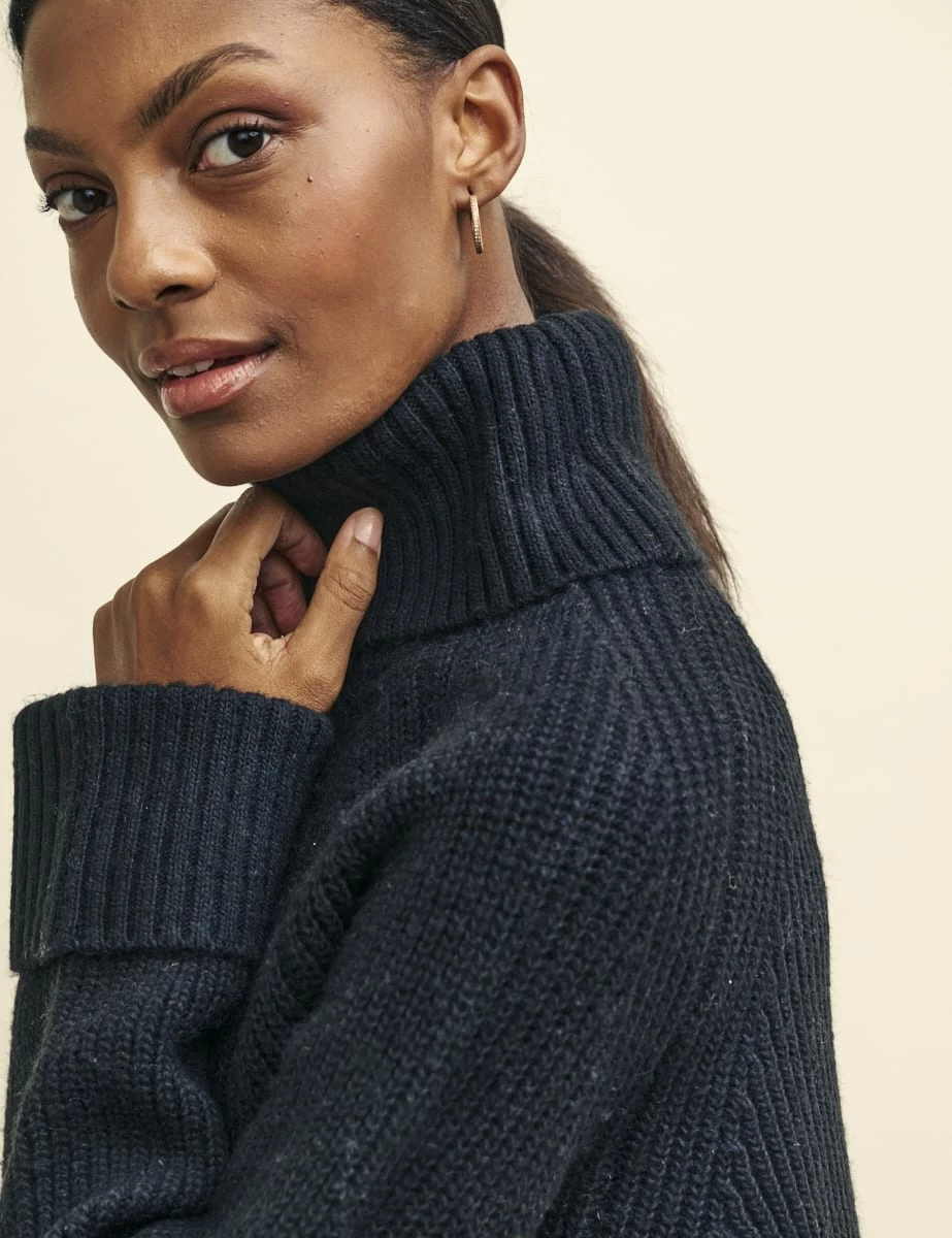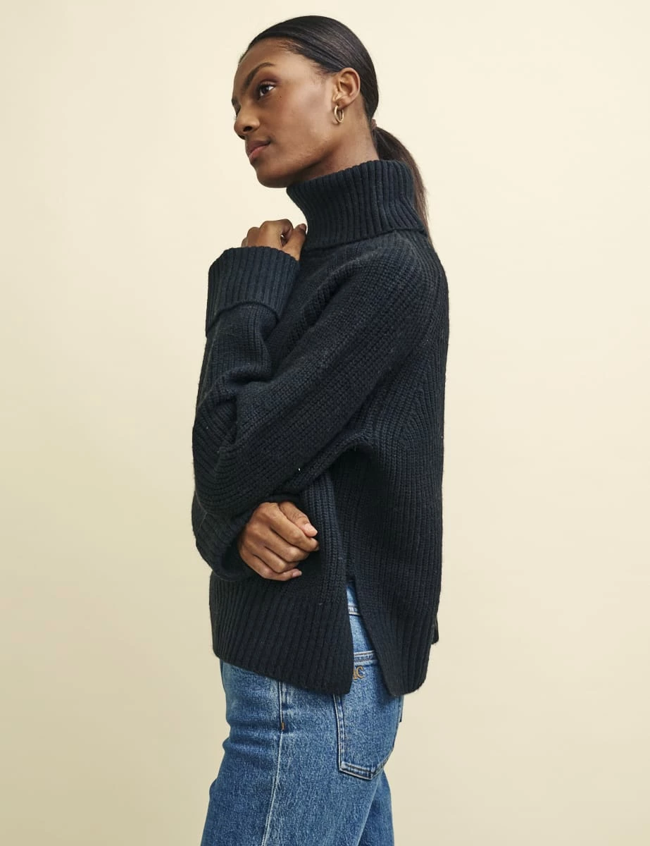 It’s not winter without a chunky roll neck. Made from a blend that includes recycled materials and a touch of wool, this classic black jumper is super cosy with a ribbed feel. The cut is designed to fit perfectly oversized with split side seams. Style yours with your favourite denim.