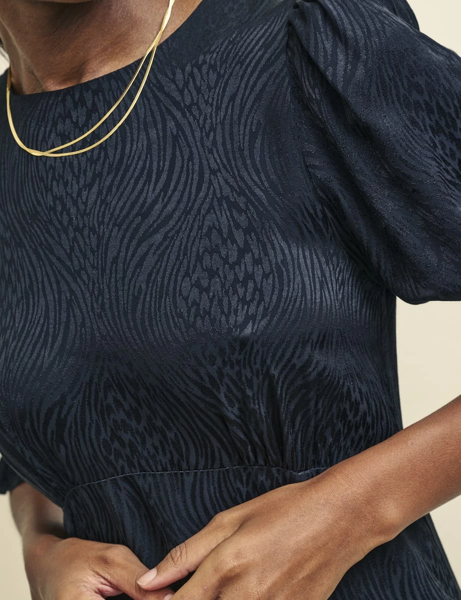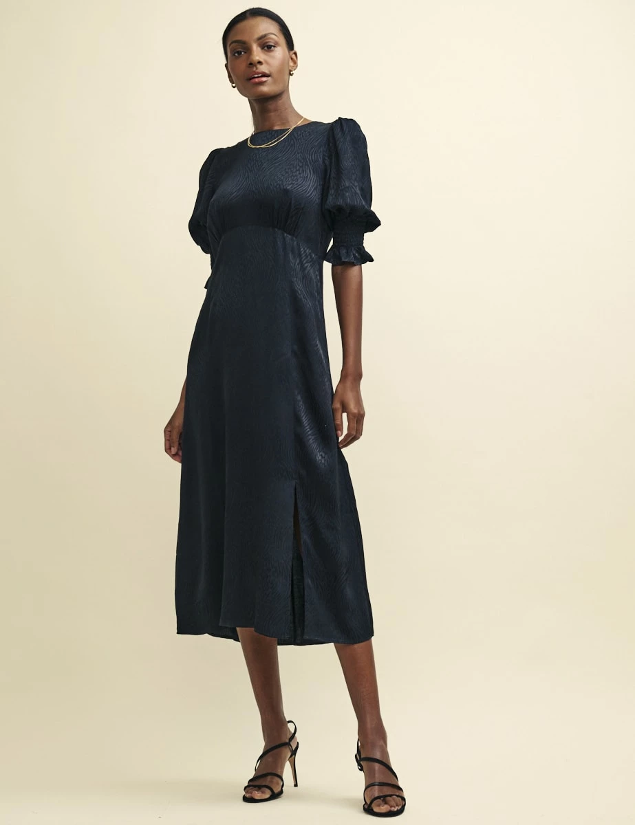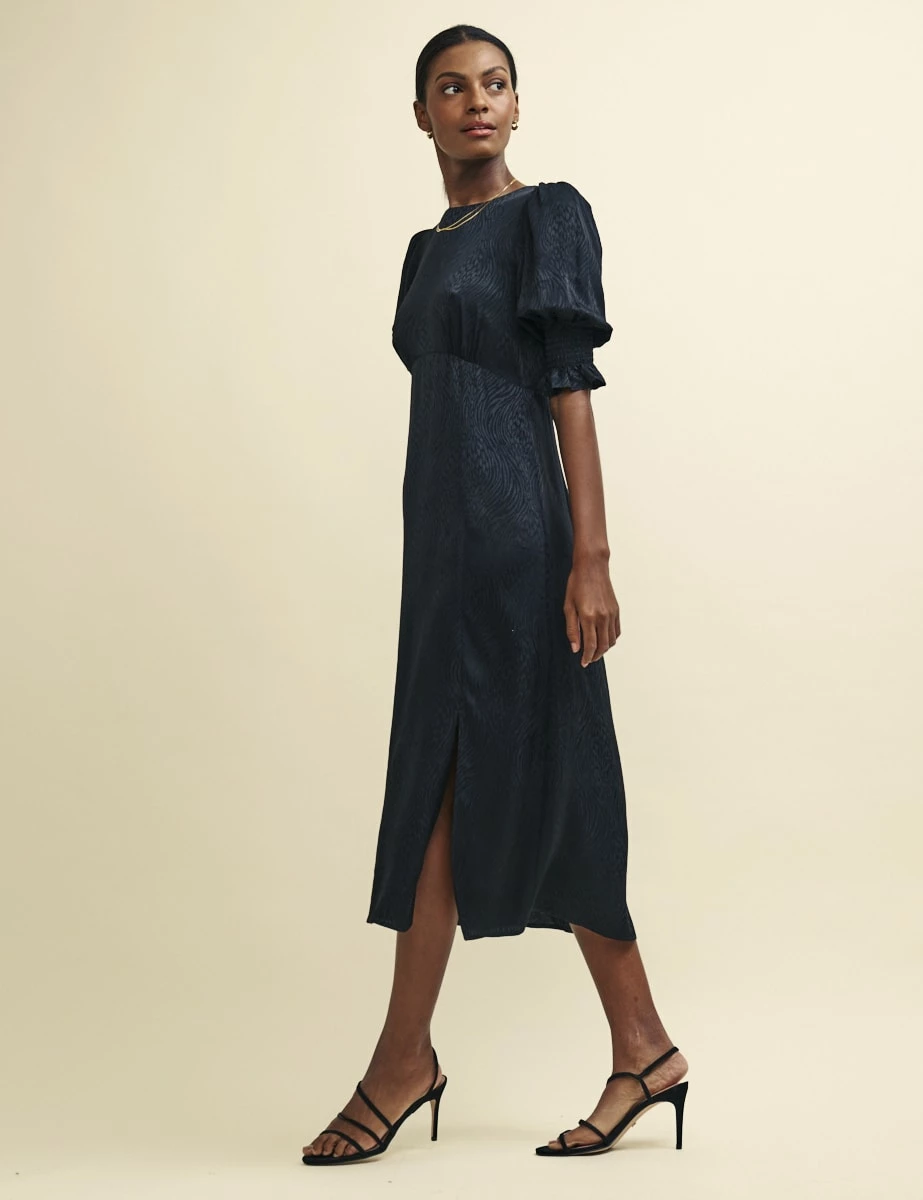 Expect compliments in our Luna midi. In a vintage-inspired shape with shirred cuffs, subtle frills and a leg-lengthening slit, she’s low-key but elevated in an instant. So much more than just a black tea dress, Luna does dinner reservations too – and we love her in this new satin jacquard design detailed with a brushstroke pattern. Elevate yours with barely-there sandals or towering platforms.