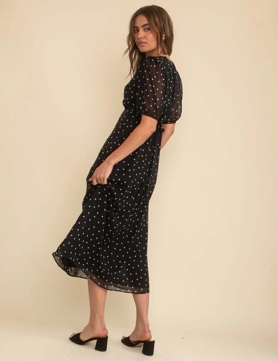 Black Spot Print Chiffon Wrap Molly Midi Dress