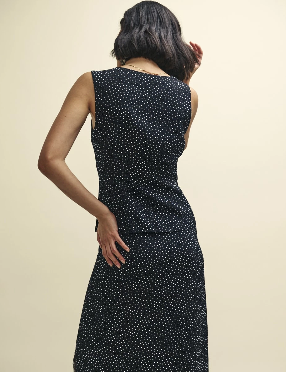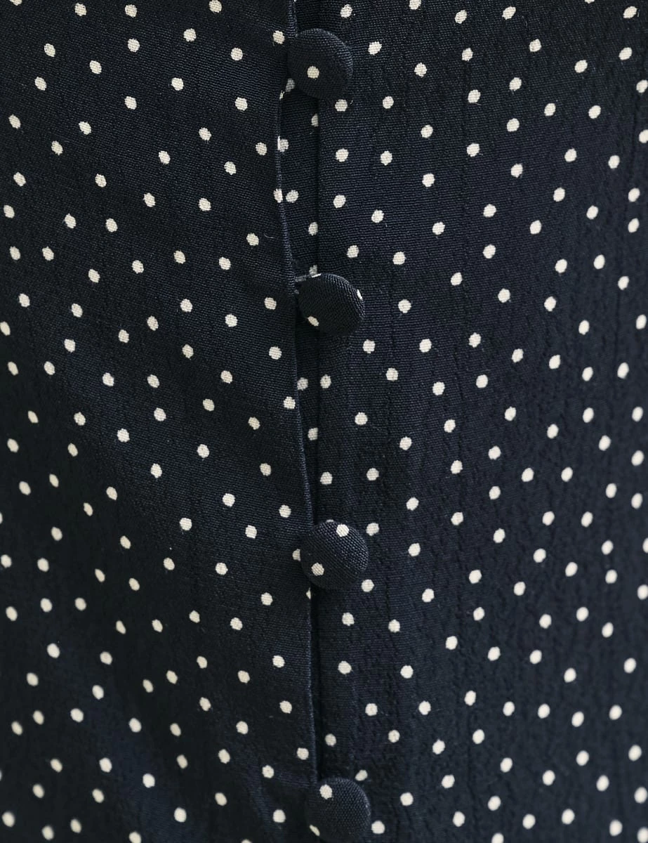 There’s something about Joni. Made from a responsible viscose blend, this black polka dot number is perfect for that thing you’ve got to go to. We love the fabric covered buttons and cut-out detailing swathed in lace. Style yours with your favourite denim.