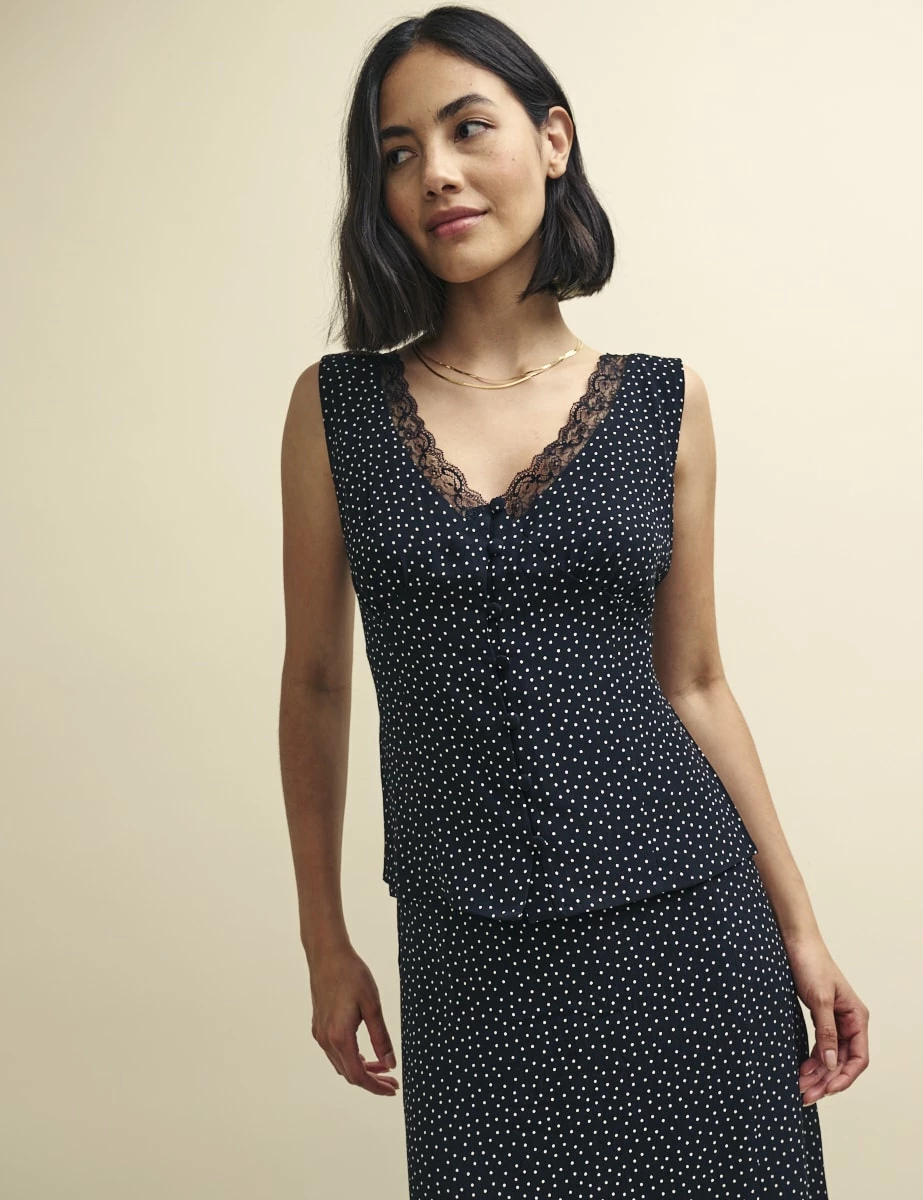 Black Spot Print Lace Detail Cami Top