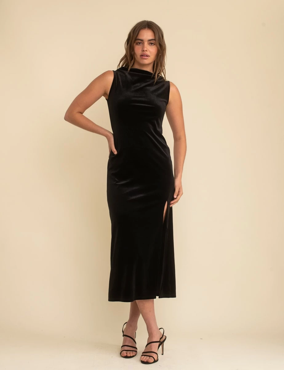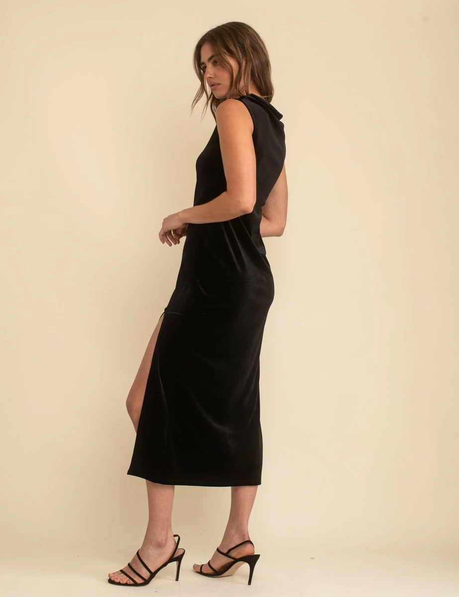 Date night ready. Made from a blend that includes recycled materials, this plush black velvet dress is sure to result in all the compliments. Designed to cut close, it also features a side slit for added movement. Elevate yours with gold jewellery.