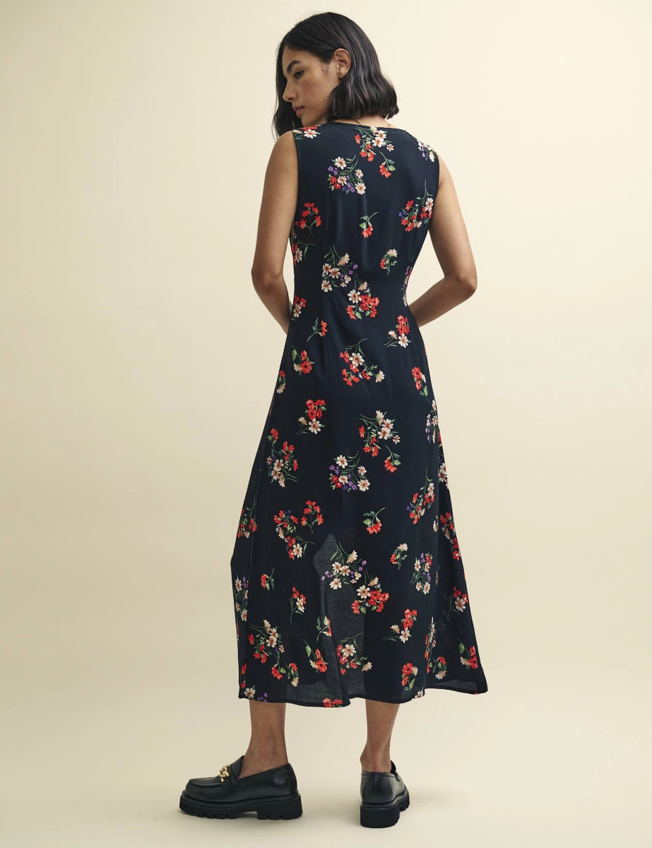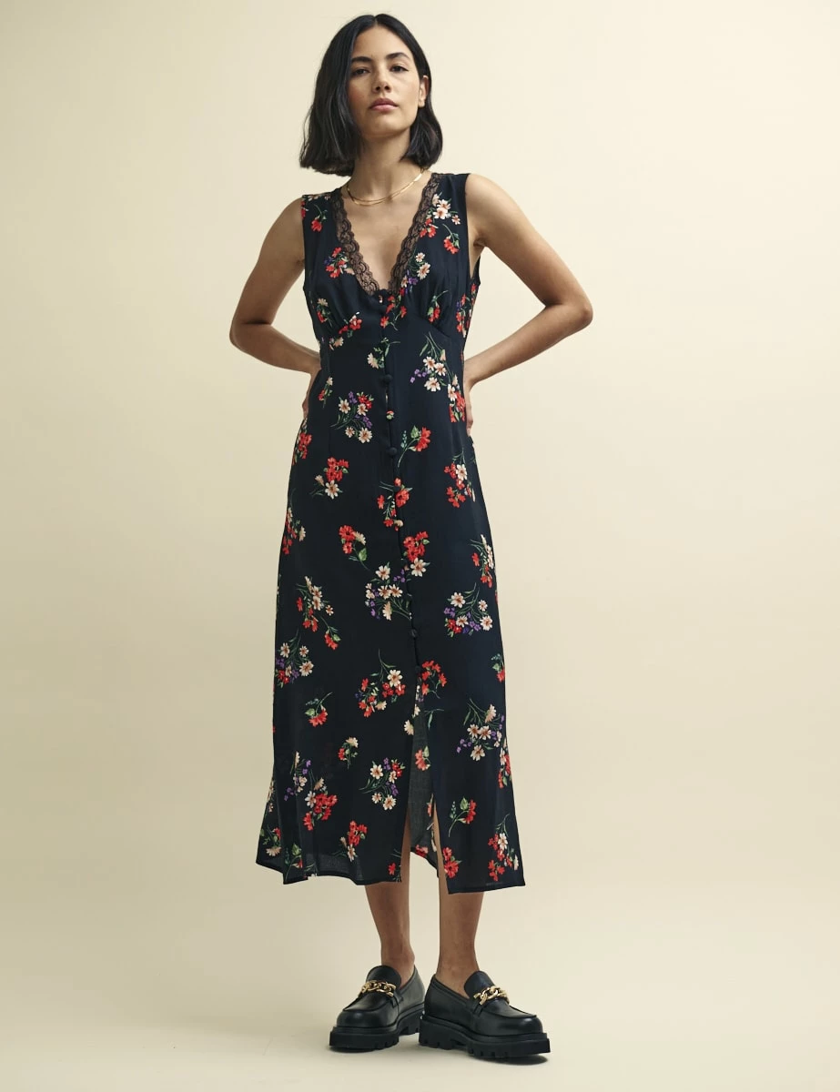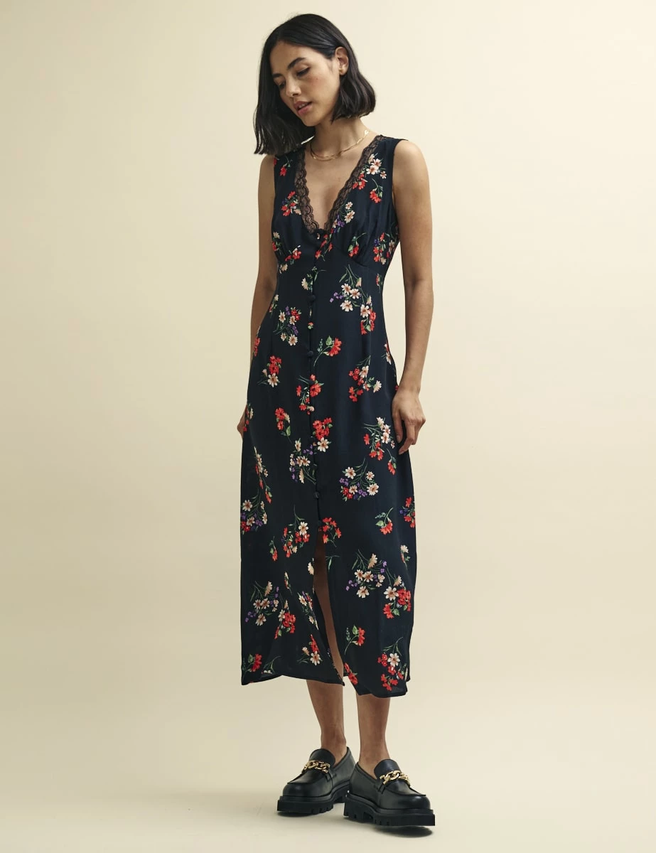 Joni does dinner and dancing. Effortlessly easy to dress up, this wildflower printed midi is sure to be a sultry favourite. We love the lace inserts – revealing just a touch of skin – and the delicate line of fabric covered buttons. Balance the look with stompy boots.