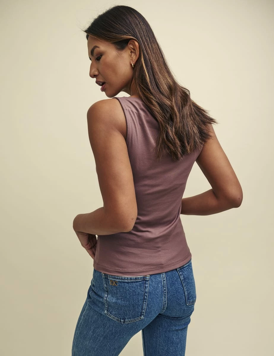 Cowl neck tops are back. Made from responsible viscose blended with a touch of stretch, this new number will go with everything you already own in a soft shade of mink. It’s designed to cut close in a figure-framing fit. Just add gold jewellery.