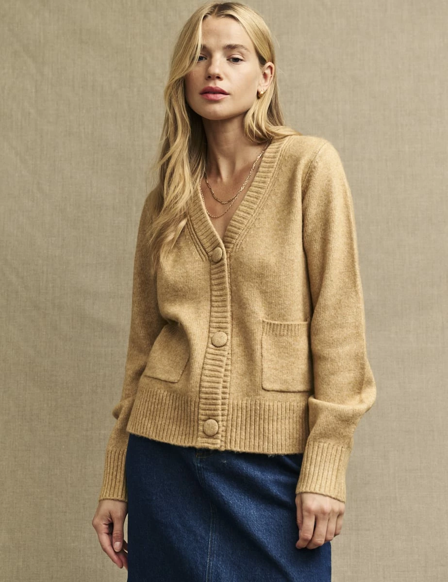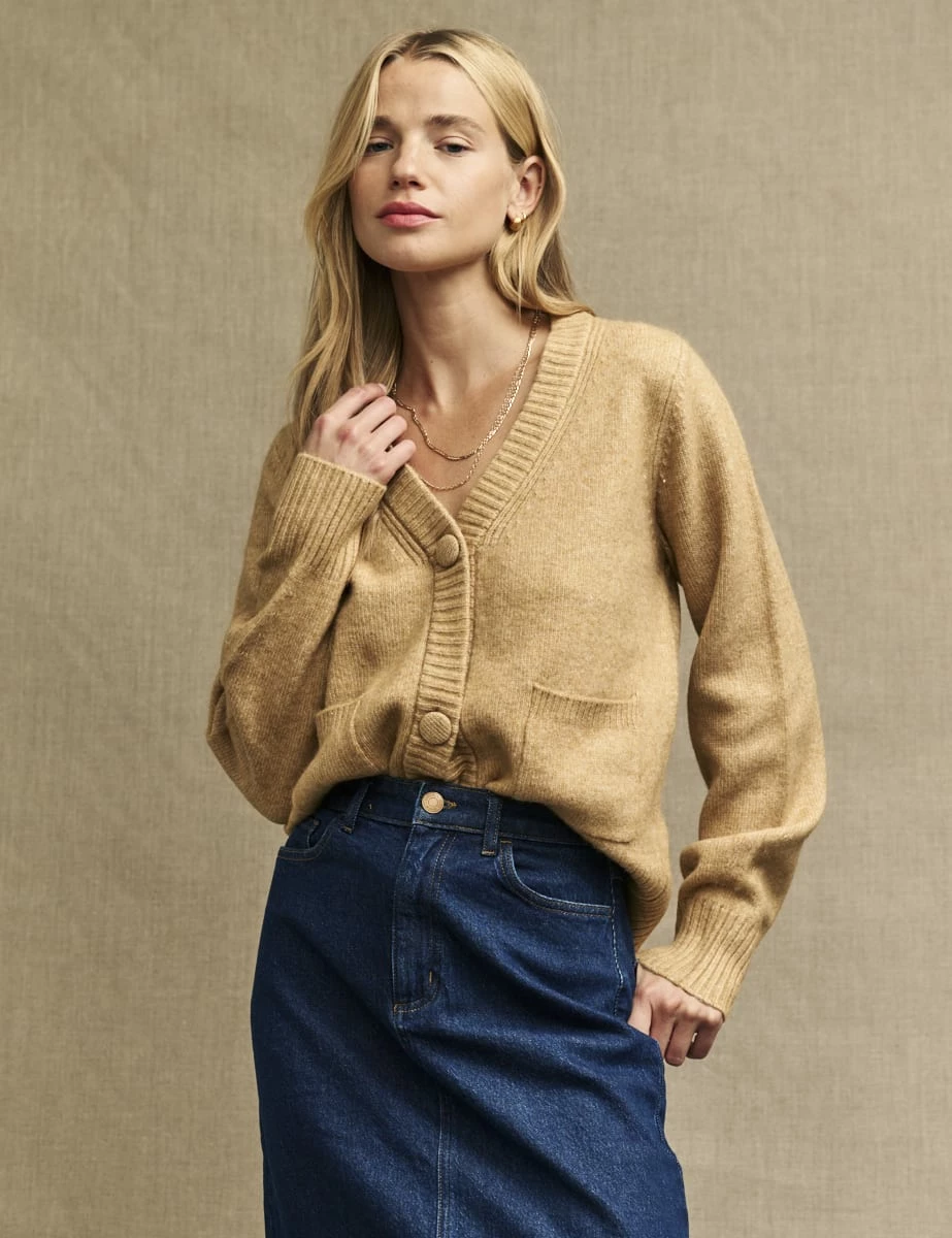 This caramel cardigan is a dream. Made from a blend that includes recycled materials and a touch of wool, it’s soft with a statement pocket detail. We love it styled solo with layers of gold jewellery.