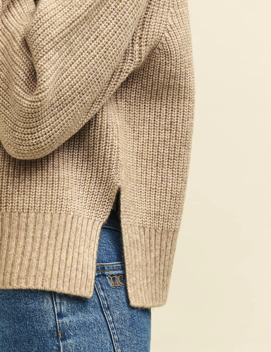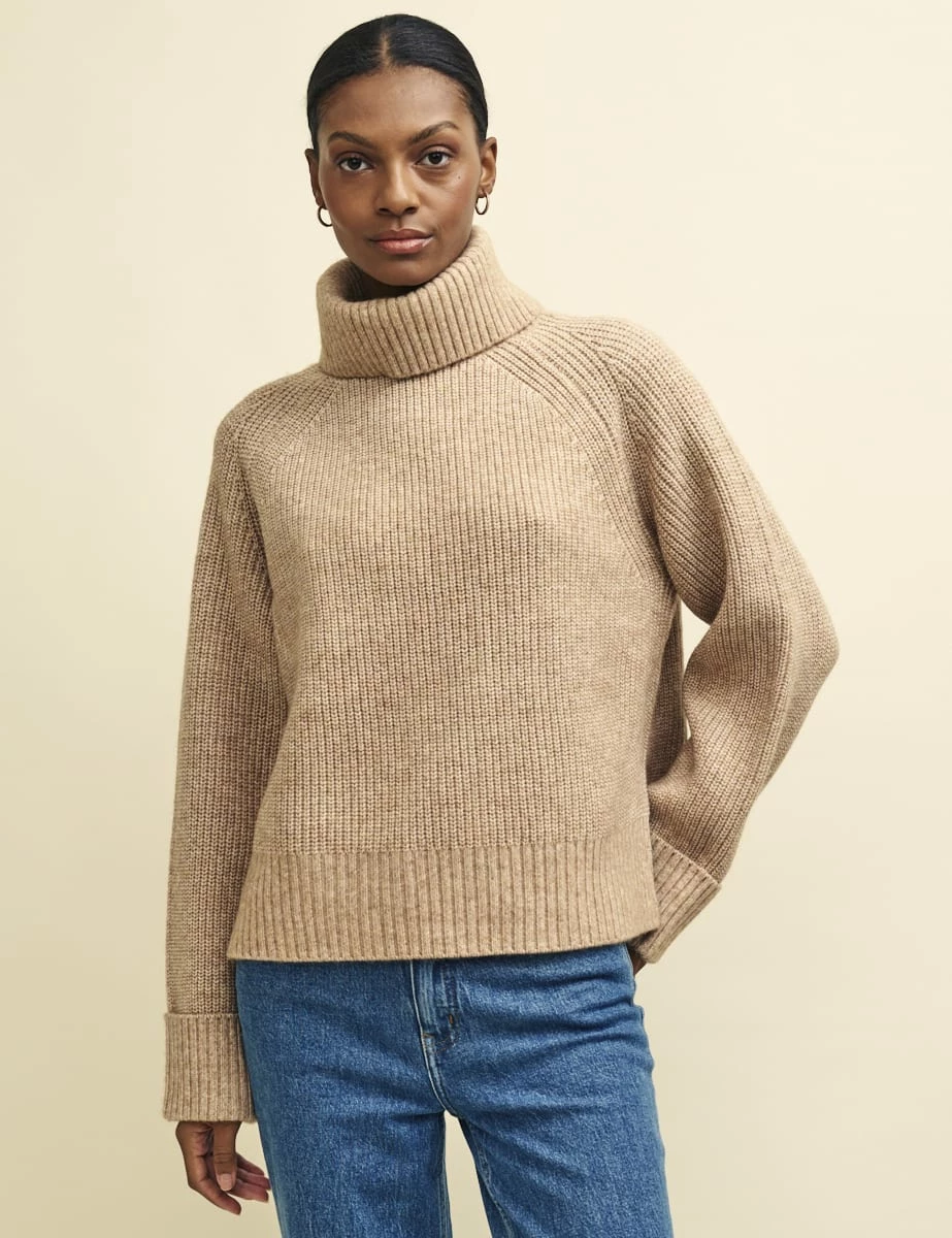 It’s not winter without a chunky roll neck. Made from a blend that includes recycled materials and a touch of wool, this biscuit-coloured jumper is super cosy with a ribbed feel. The cut is designed to fit perfectly oversized with split side seams. Style yours with your favourite denim.