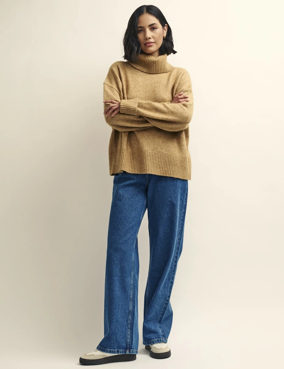 It doesn’t feel like autumn until you’ve pulled a roll neck jumper on. Made from a super soft fabric blend that includes recycled materials and a touch of wool, this knit is pure cosiness. We love the biscuit shade finished with pink contrast detailing. Style yours with your favourite denim.