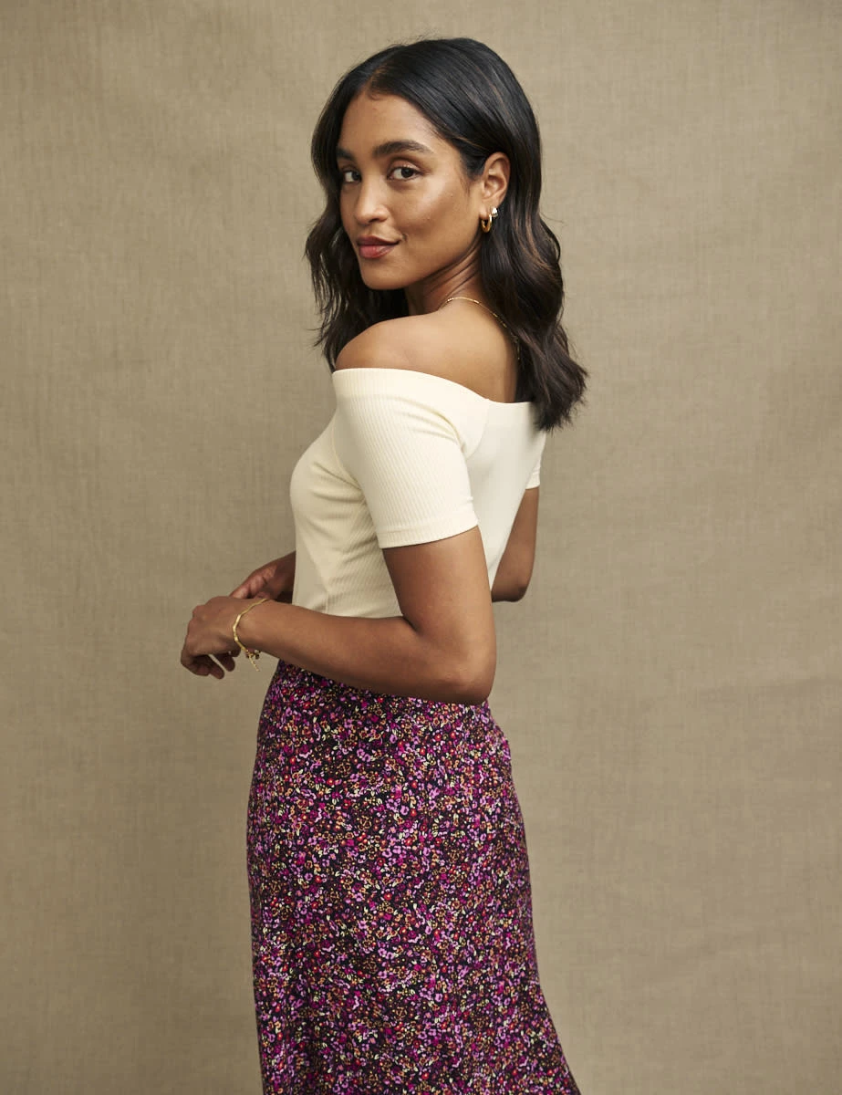 We’re seriously into an off-the-shoulder moment. Made from responsible viscose that’s cut with a dash of stretch, this cream top is sure to highlight your frame perfectly. Just add a swishy midi skirt.