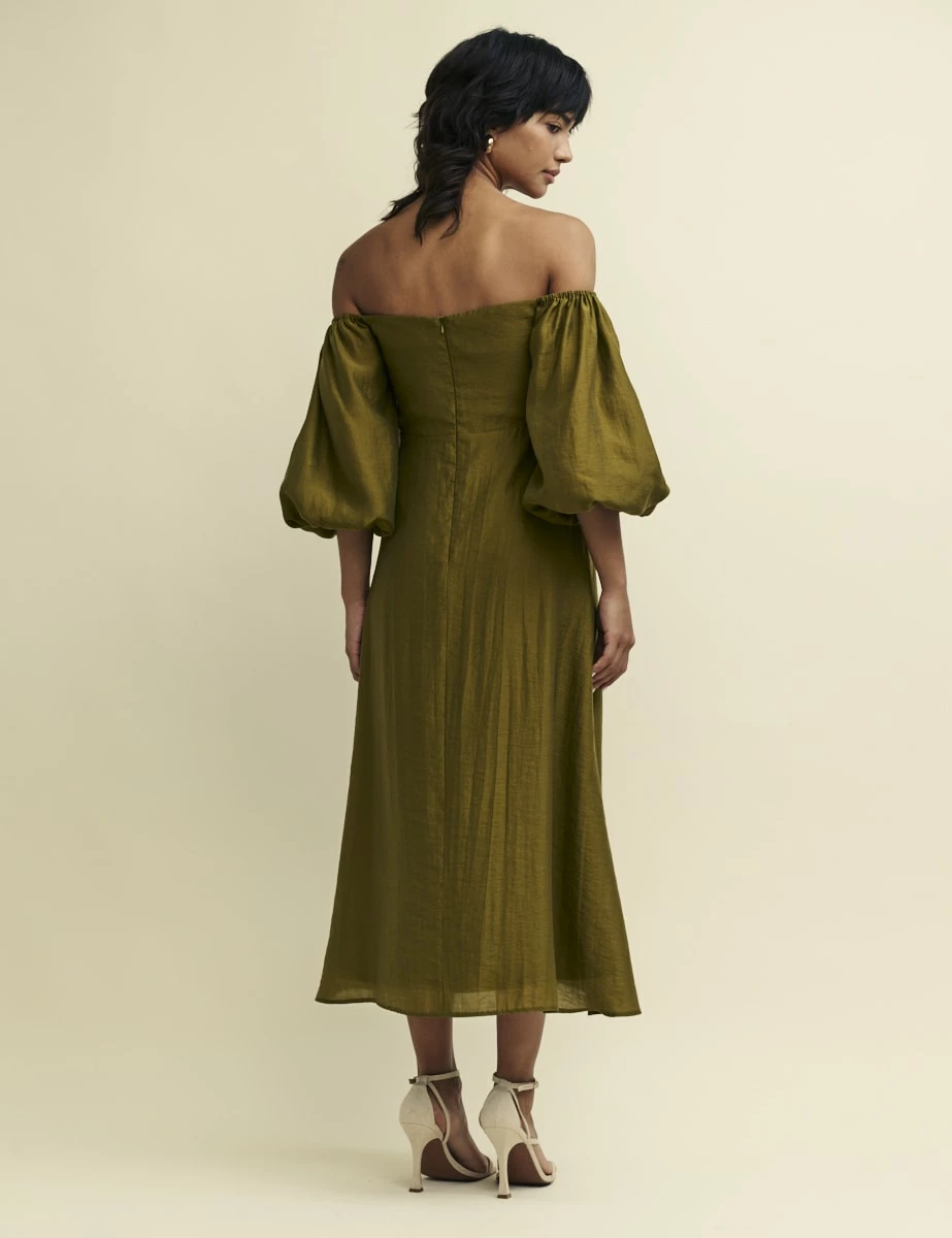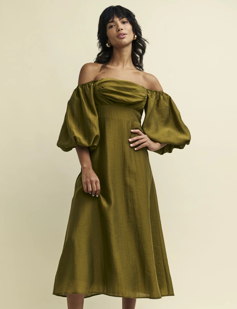 Just stunning. In olive green, our Maxine midaxi is the dress for all those invitations filling up your diary. Cut from a responsible lyocell blend, she feels effortlessly floaty. Secondly, you can wear the voluminous puff sleeves on or off the shoulder depending on how you feel that day. Style with your favourite clutch bag.