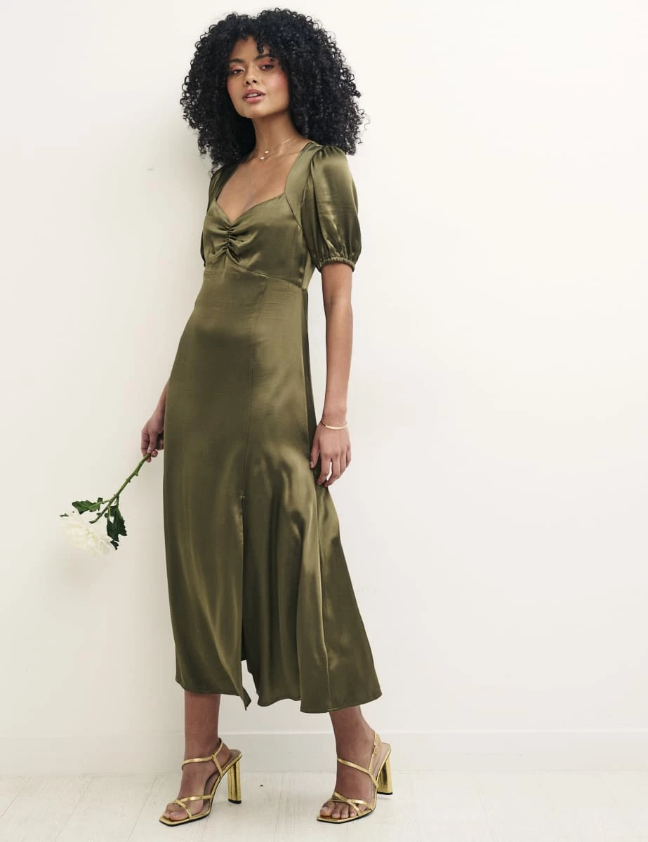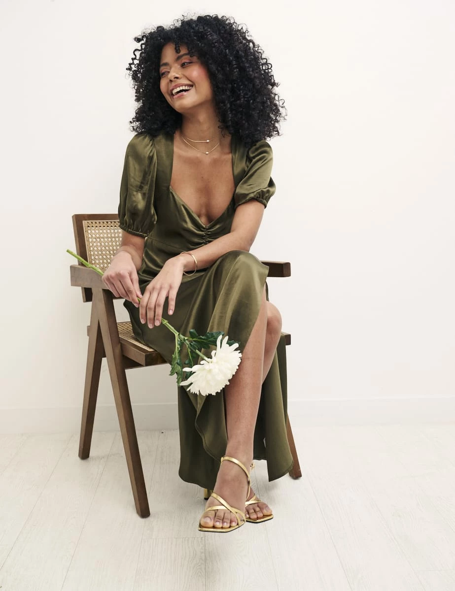 Walk down the aisle with the NC bridal party collection. Looking for more sustainable ways to say ‘I do’? Couple locally grown flowers with responsibly made dresses designed to be worn again and again. Jude is the dress for bridesmaids that don’t want to look like bridesmaids. Crafted from silky olive satin, it’ll pick out the green tones in your foliage perfectly. Wear with platforms now and stompy boots later.