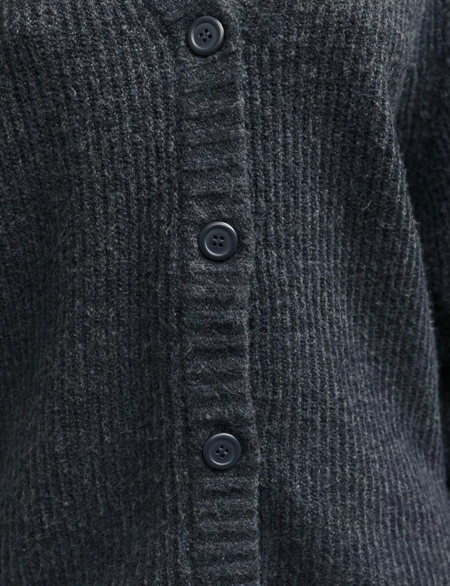 We’ve got a soft spot for this cardigan. Made from fluffy charcoal fabric, it features a button-through front, ribbed detailing and a deep v-neckline that’s perfect for layering or styling solo. Elevate yours with a silky satin midi skirt.