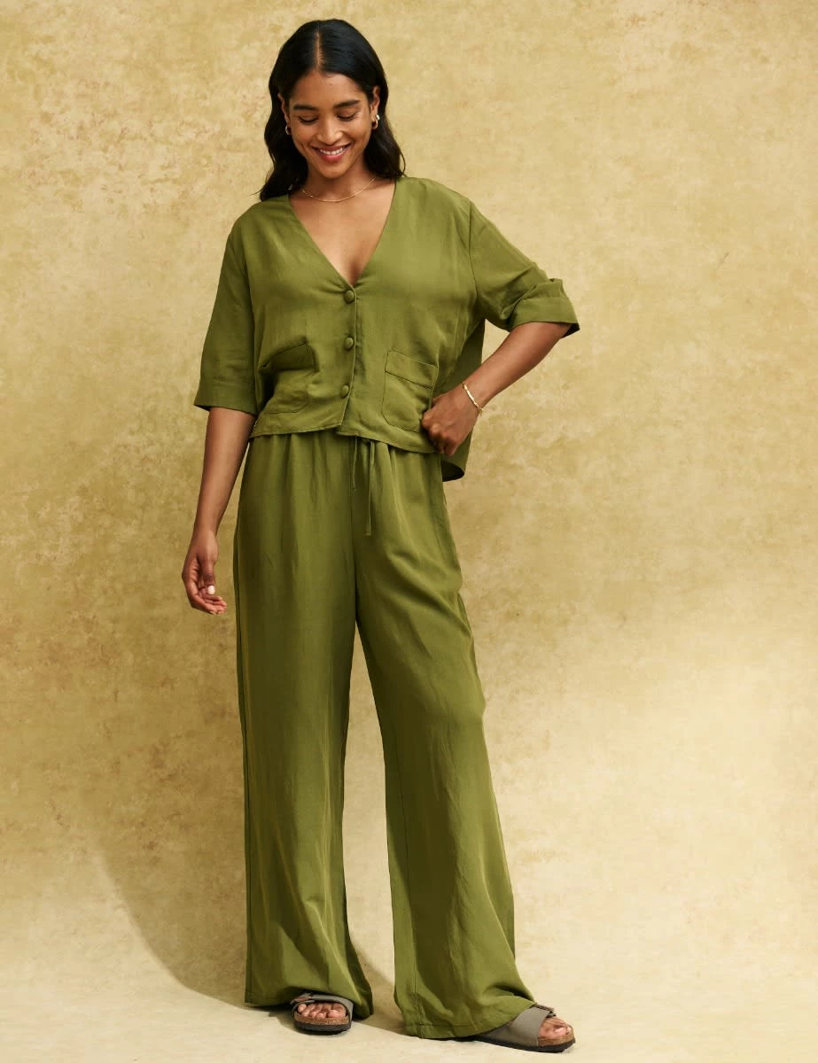 A boxy shirt is so easy to wear. Made from responsible viscose blended with a touch of linen, this khaki one’s perfect for summer. Style yours with high waisted denim.