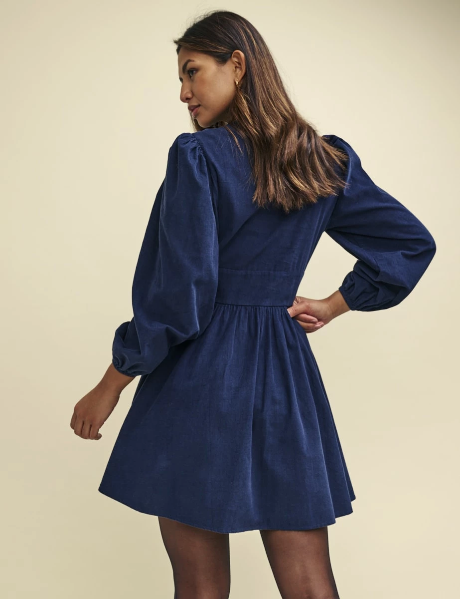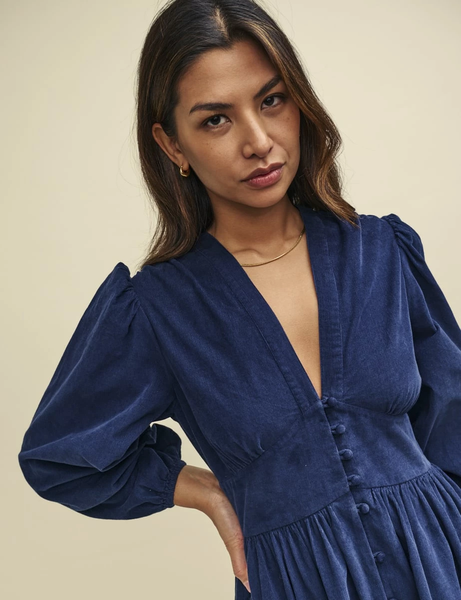 Starlight now comes in cord. Made from organic cotton, this navy mini will go from desk to after-dark drinks. We’re swooning over her balloon sleeves and pretty line of covered buttons. Just add knee high boots.