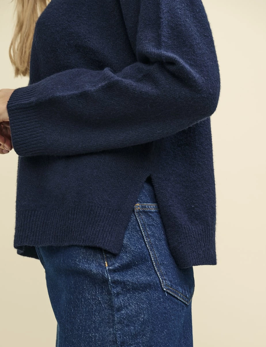Truly timeless. Crafted from a responsible fabric blend, this navy jumper is made partly from recycled materials knitted with organic cotton. Side slits add to the laidback cut. Style yours with a denim midaxi for a so-now look.