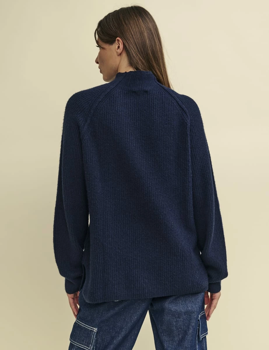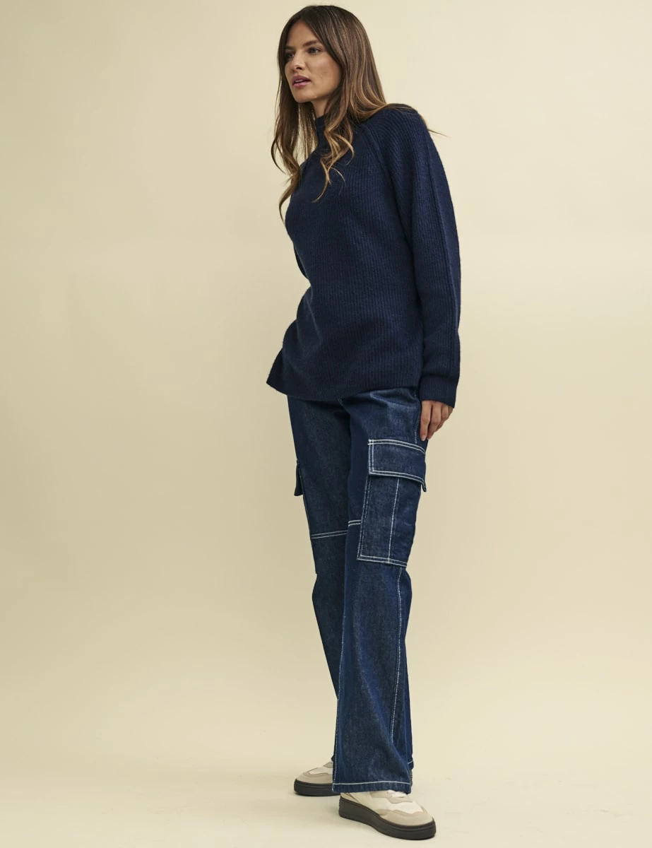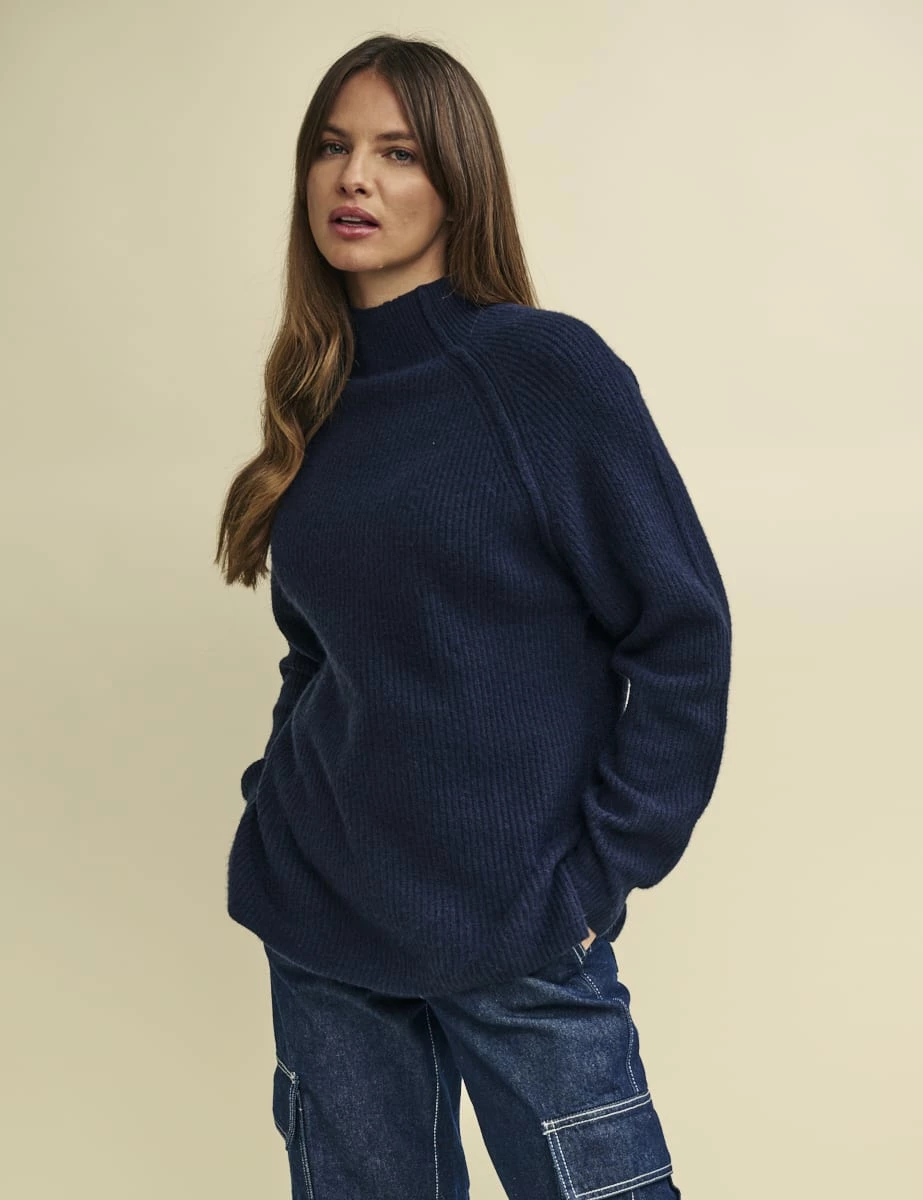 We love the cosiness of this long line jumper. Made from a fluffy fabric blend that includes recycled materials and organic cotton, this soft knit is timeless in navy blue. Statement seam offers a point of difference to any other jumper in your drawer. Wear yours with everything you already own.
