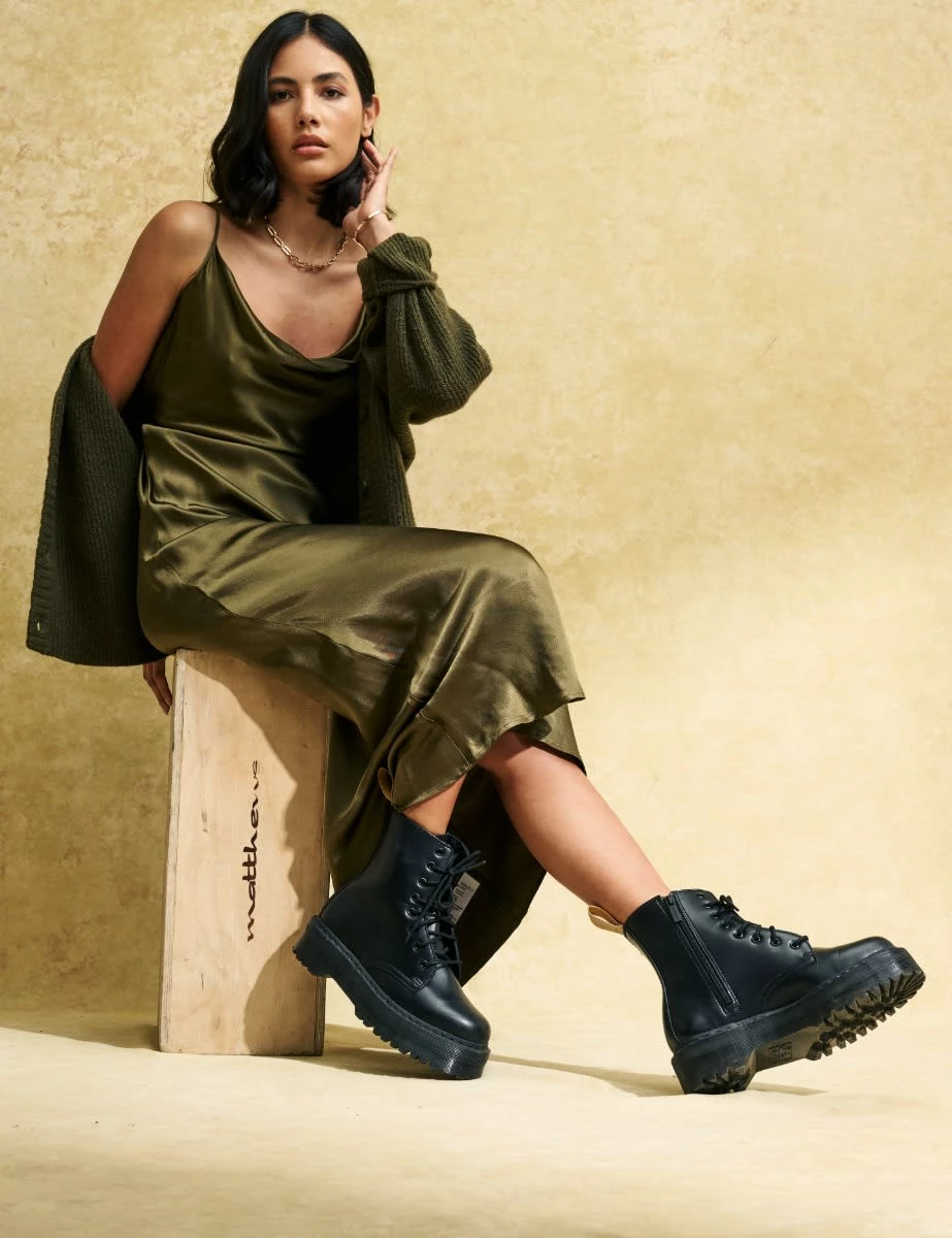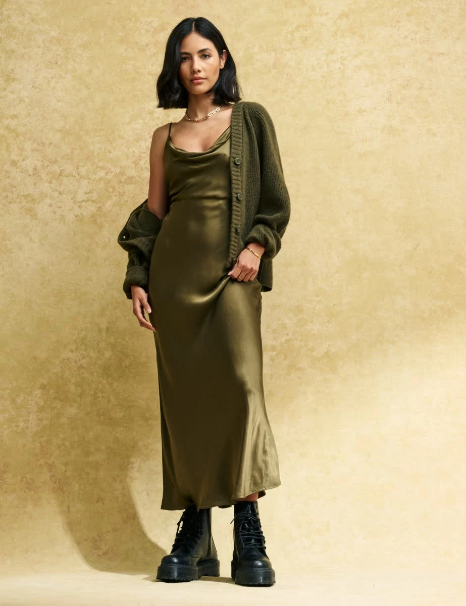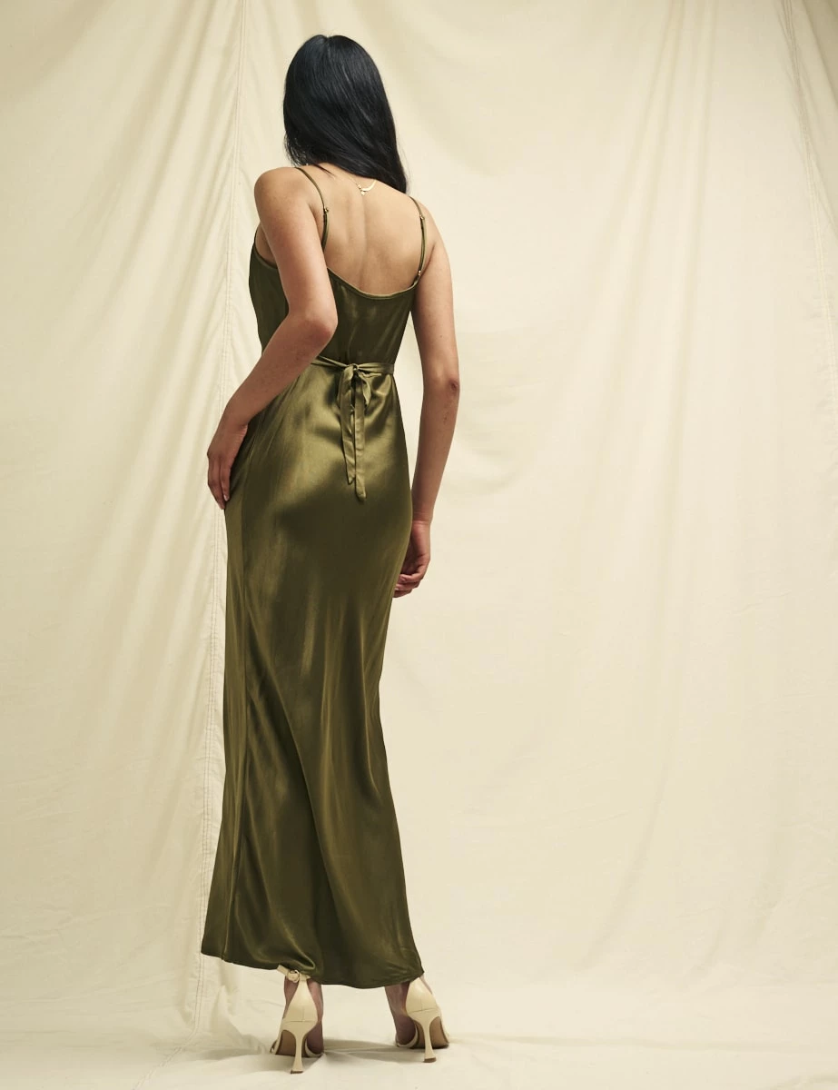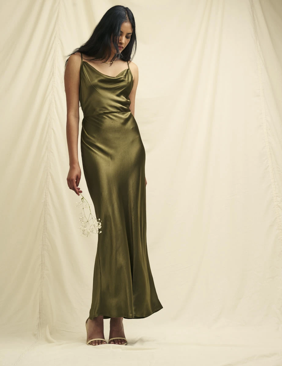 Walk down the aisle with the NC bridal party collection. Looking for more sustainable ways to say ‘I do’? Couple locally grown flowers with dresses designed to be worn again and again. Trixie is made from 42% responsible viscose. This olive green slinky satin slip is framed by barely-there straps and a soft cowl neckline that’s perfect for weddings. Cut on the bias, the lightly flared midaxi hem is effortlessly flattering. Style elegantly with strappy sandals and a single stem.