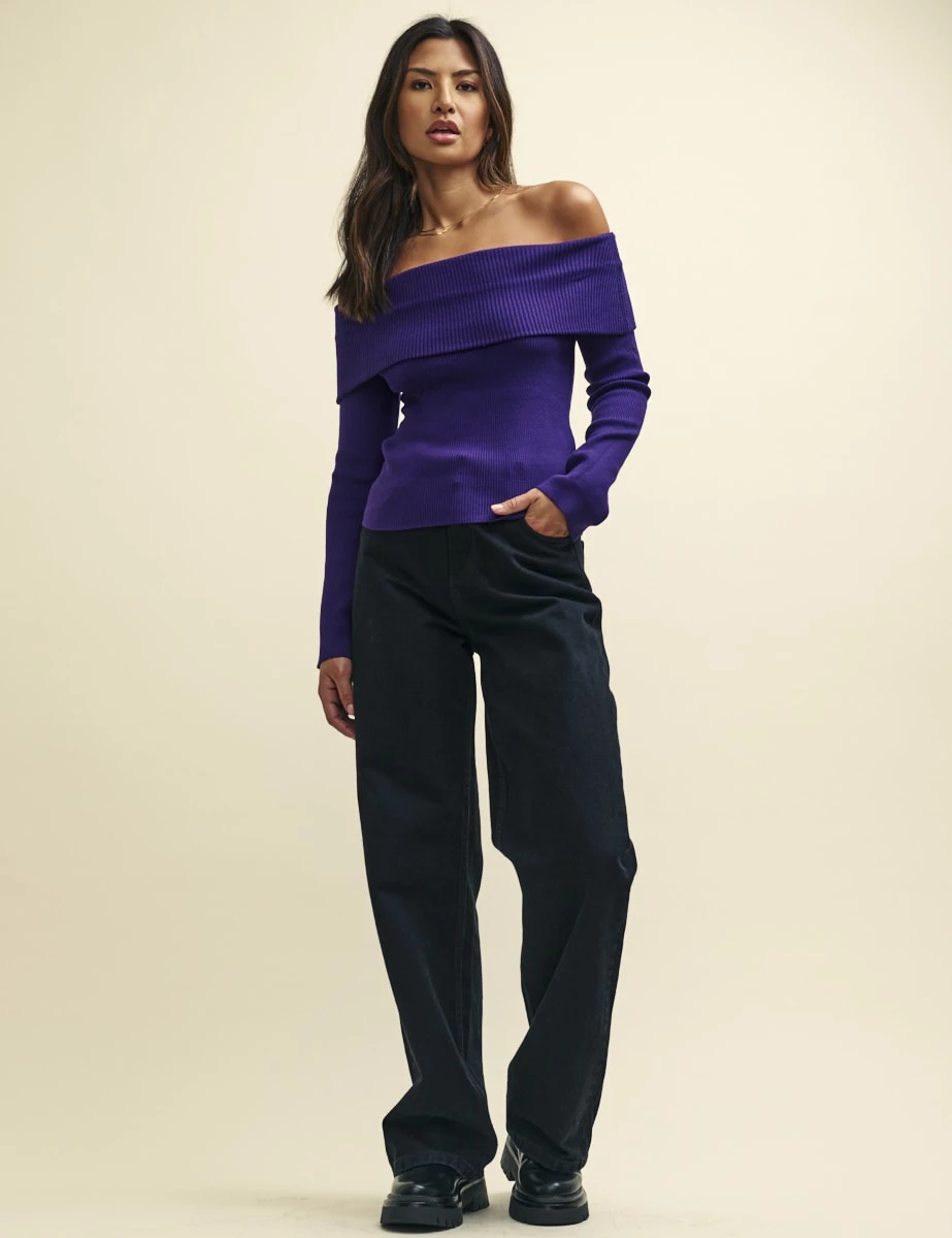 Off-the-shoulder tops are so in. Add this purple Bardot knit to your wardrobe this autumn. Made from a responsible viscose blend, it’s super soft and lightly ribbed. Balance the look with wide leg trousers.