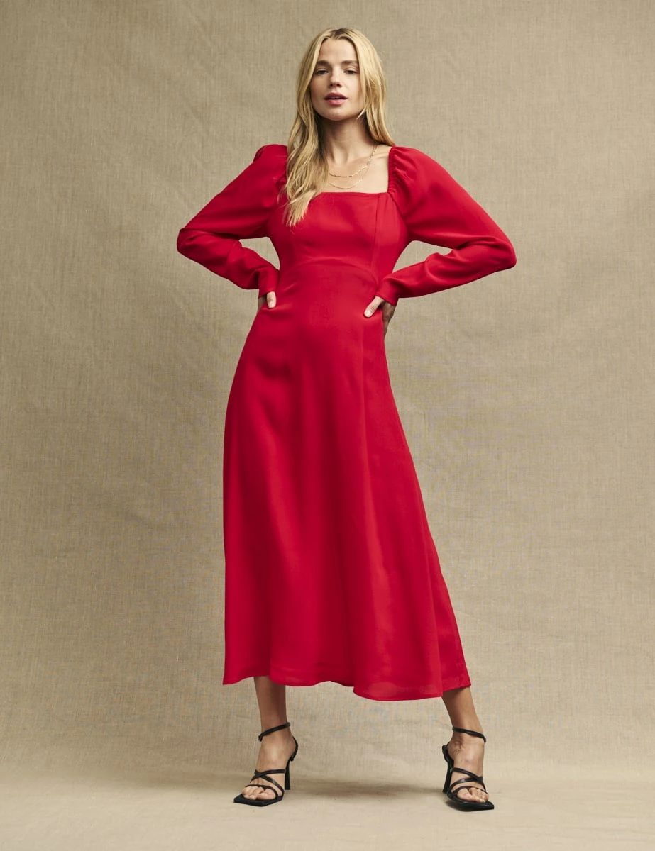 This statement red midi dress has it all going on. Designed for all manner of occasions, Abby’s set to be a hot favourite this winter. She also flatters effortlessly with this season’s sought-after square neckline and a shirred back for an always perfect fit. The little tie that wraps around the back is a detail that’s not to be missed. Elevate yours with barely-there sandals.