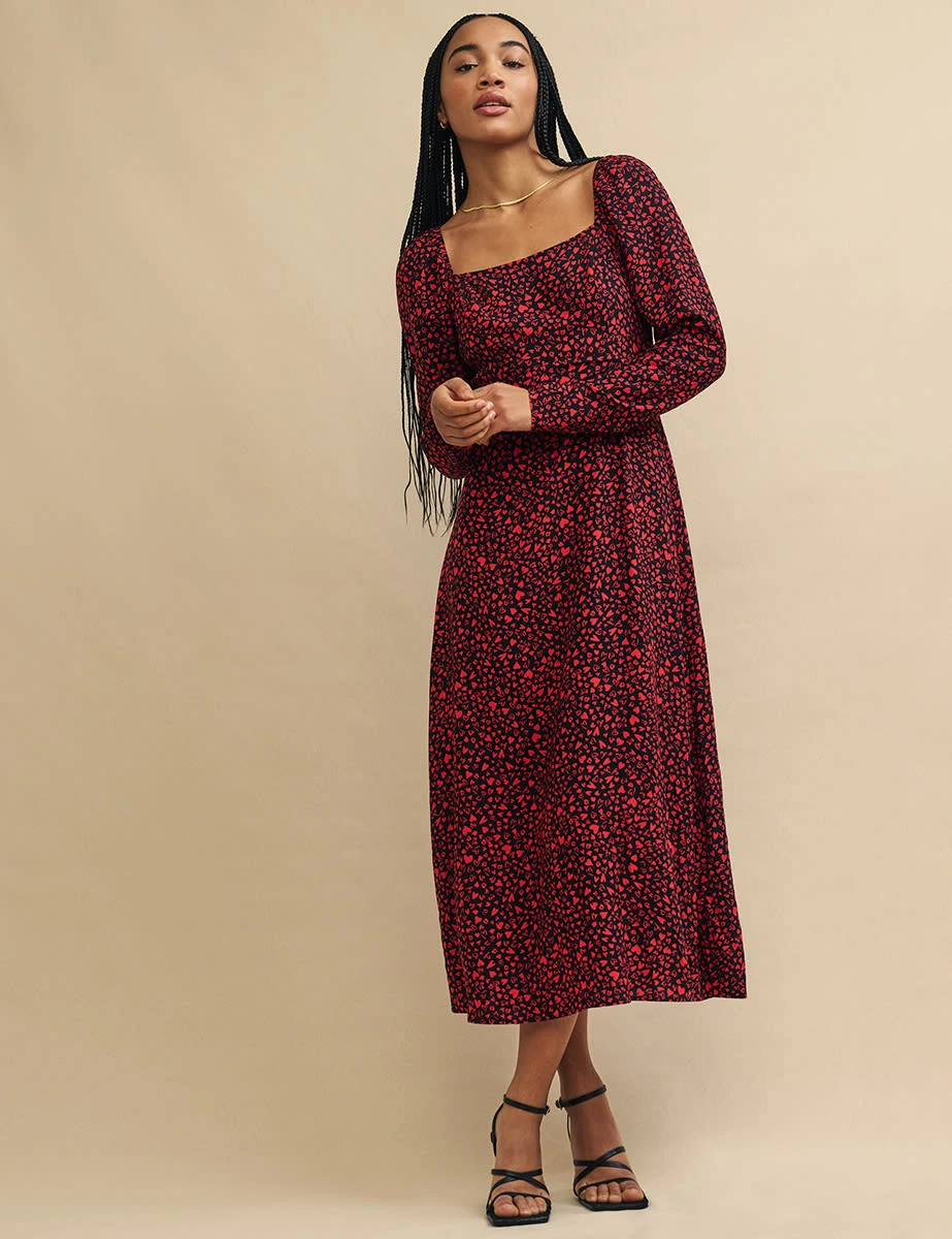 Fall for me. Designed for all manner of occasions, Abby’s designed to be loved in a red heart print made entirely from responsible viscose. She also flatters effortlessly with this season’s sought-after square neckline and a shirred back for an always perfect fit. The little tie that wraps around the back is a detail that’s not to be missed. Elevate yours with barely-there sandals.